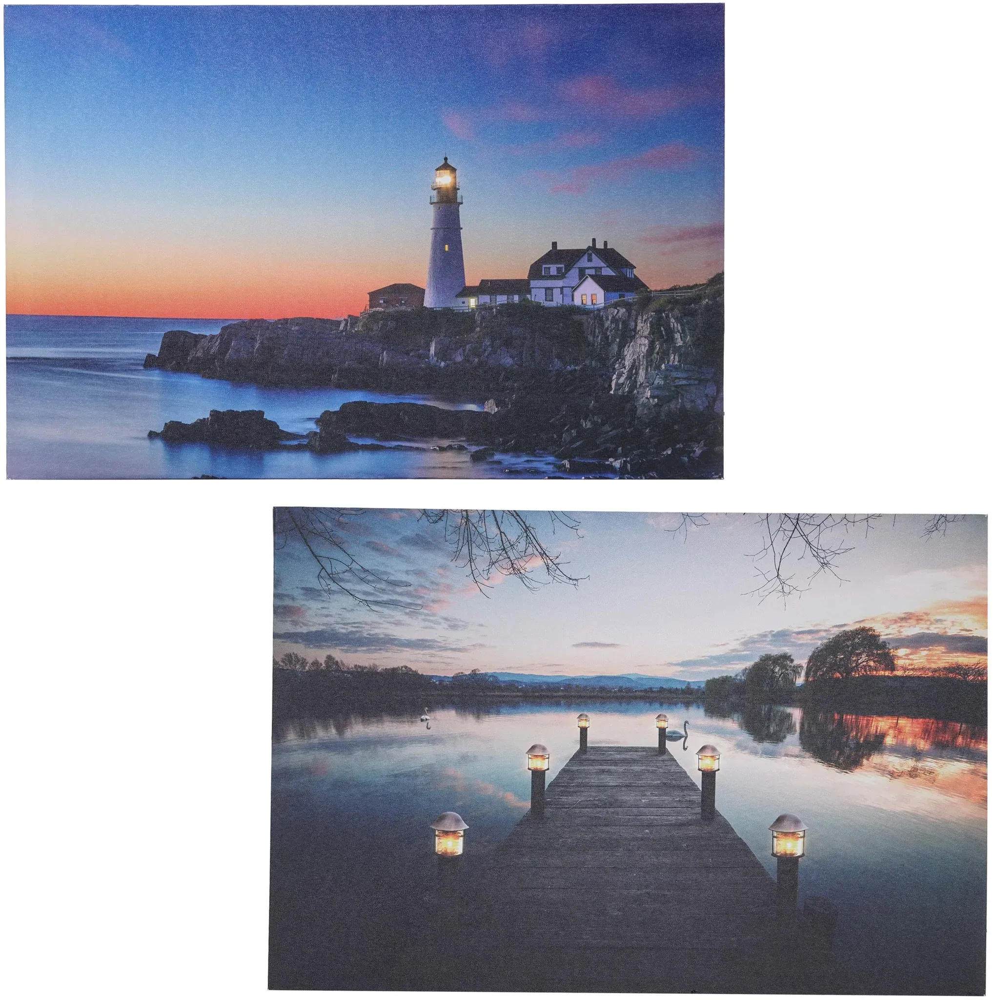 Verfügbarkeit: Auf Lager - Kategorie: Sonstige Wanddekoration - Nexos Trading - GTIN:4025327750205 - Dekoratives Leuchtbild: Maße: 40 x 50 cm. Das Bild ist bereits fertig montiert und mit einer Aufhängung versehen. Das Motiv der romantischen, winterlichen Dekoration vor einer Berghütte, zaubert angenehme Stimmung und Atmosphäre. Die Kerzen erstrahlen durch je eine warm weiße LED in bezauberndem Licht. Der hochwertige Fotodruck auf Leinwand ist nicht nur zu Weihnachten eine schöne Dekoration oder ein tolles Geschenk. Beleuchtung durch warmweiße LEDs mit Flackerflammeneffekt inkl. Batteriebox mit An-/Ausschalter an der Rückseite. Durch den Batteriebetrieb haben Sie kein störendes Kabel und können das Leuchtbild ganz individuell anbringen. Setzen Sie farbige Akzente im Treppenhaus, Wohnzimmer, Büro oder Schlafzimmer. - 16,99 Euro bei Amazon Marketplace Home - gefunden von billiger.de Dieses 2er-Set LED-Bilder mit Leuchtturm-Motiv bietet eine schöne maritime Dekoration zu einem attraktiven Preis. ![]() ![]() Mendler 2er-Set LED-Bild, Leinwandbild Leuchtbild Wandbild 40x60cm, Timer ~ Lighthouse