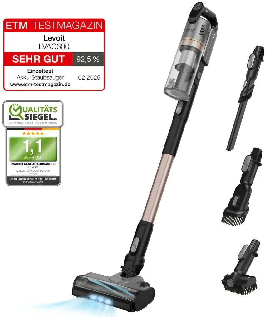 Zustand: Neu - Stabstaubsauger & Elektrische Kehrbesen - Levoit Leviot - LVAC-300DE - EAN: 0810123674046 - ð—šð—¿üð—»ð—±ð—¹ð—¶ð—°ð—µð—² ð—¥ð—²ð—¶ð—»ð—¶ð—´ð˜‚ð—»ð—´ ð—ºð—¶ð˜ ð—±ð—²ð—º ð—Ÿð—©ð—”ð—– ðŸ¯ðŸ¬ðŸ¬ - ð˜‚ð—»ð˜€ð—²ð—¿ð—²ð—º ð—¹ð—²ð—¶ð˜€ð˜ð˜‚ð—»ð—´ð˜€ð˜€ð˜äð—¿ð—¸ð˜€ð˜ð—²ð—» ð—¦ð˜ð—®ð˜‚ð—¯ð˜€ð—®ð˜‚ð—´ð—²ð—¿ ð—ºð—¶ð˜ ð—™ð—¶ð—¹ð˜ð—²ð—¿ð—¹ð—²ð—¶ð˜€ð˜ð˜‚ð—»ð—´ ð—®ð˜‚ð—³ ð—±ð—²ð—º ð—¡ð—¶ð˜ƒð—²ð—®ð˜‚ ð—²ð—¶ð—»ð—²ð˜€ ð—Ÿð˜‚ð—³ð˜ð—¿ð—²ð—¶ð—»ð—¶ð—´ð—²ð—¿ð˜€ ð—”ð—¹ð—¹ð—²ð˜€ ð—¶ð—» ð—²ð—¶ð—»ð—²ð—º ð—¦ð˜ð—®ð˜‚ð—¯ð˜€ð—®ð˜‚ð—´ð—²ð—¿: Der motorisierte Tierhaaraufsatz entfernt Tierhaare und Schmutz von sämtlichen Polstermöbeln; Die 2-in-1 Fugendüse sorgt für eine effiziente Reinigung schwer zugänglicher Bereiche ðŸµðŸµ,ðŸµðŸµ ð—£ð—¿ð—¼ð˜‡ð—²ð—»ð˜ ð—›ð—˜ð—£ð—”-ð—˜ð—³ð—³ð—¶ð˜‡ð—¶ð—²ð—»ð˜‡: Dank des 5-stufigen HEPA-Filtersystems wird die Abluft zu 99,99% gefiltert; Die ausgeblasene Luft ist damit sauberer und allergenfreier als Ihre Innenraumluft ðŸµðŸµ,🵠ð—£ð—¿ð—¼ð˜‡ð—²ð—»ð˜ ð—¦ð˜ð—®ð˜‚ð—¯ð—®ð˜‚ð—³ð—»ð—®ð—µð—ºð—²: Vier Silikon- und zwei Bürstenlamellen sorgen mit 12.000 Bodenkontakten pro Minute für eine 99,9%-ige Staubaufnahme auf strukturierten Hartböden; Basierend auf EN 60312-1 ðŸ¯ðŸ¬ðŸ¬ðŸ¬ ð—ºð—”ð—µ, ð—Ÿð—²ð—¶ð˜€ð˜ð˜‚ð—»ð—´ð˜€ð˜€ð˜ð—®ð—¿ð—¸ð—²ð—¿ ... Der Levoit Akku-Staubsauger LVAC-300 Plus ist eine ausgezeichnete Wahl für eine gründliche und flexible Reinigung. ![]() kaufland.d e Levoit Akku-Staubsauger LVAC-300 Plus, 240W, HEPA, Anti-Verhedderungstechnik, 60 Min Laufzeit, ideal für Tierhaare