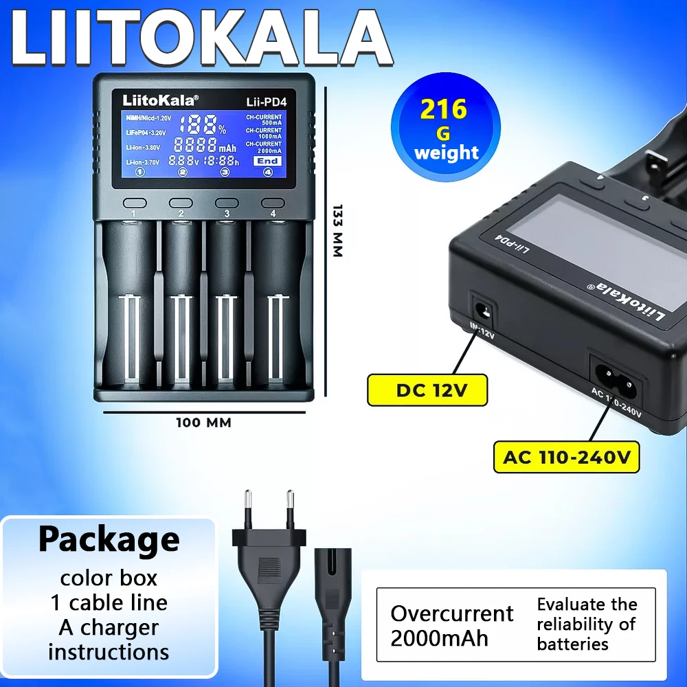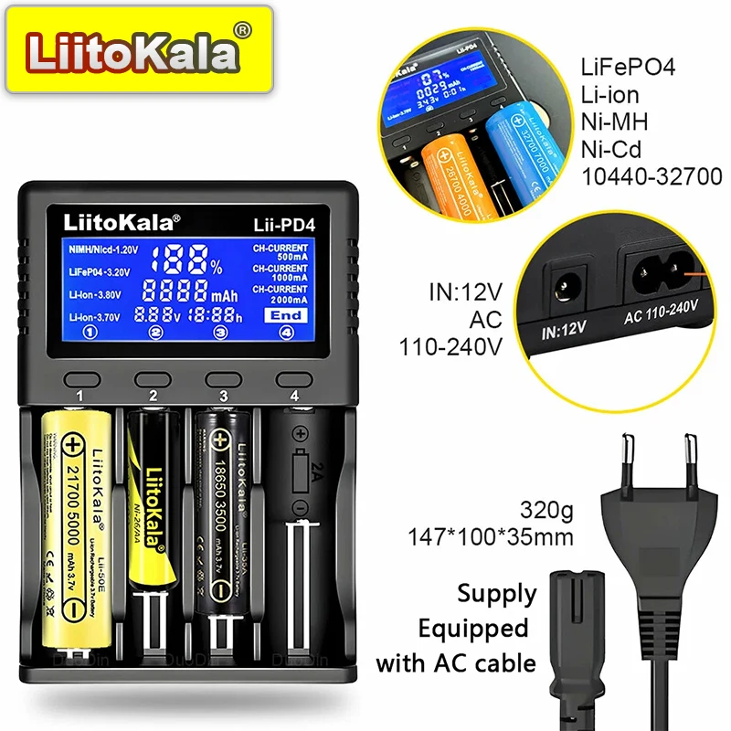 liitokala - LiitoKala LII-PD4 Smart Charger Universal für 18650 26650 21700 18350 AA AAA 3,7 V 3,2 V 1,2 V Lithium NiMH Batterie schnell sicher - bei de.aliexpress.com - aus Yadore Produktdaten Dieses Ladegerät mit 4 Slots und LCD-Anzeige ist ideal für Nutzer, die mehrere Akkus gleichzeitig laden möchten. ![]() LiitoKala Lii-PD4 4 slot LCD 18650 Batterie Ladegerät für 1,2 V 3,7 V Li-Ion 18650/18500/16340/26650/21700 /20700/18350 cr123a