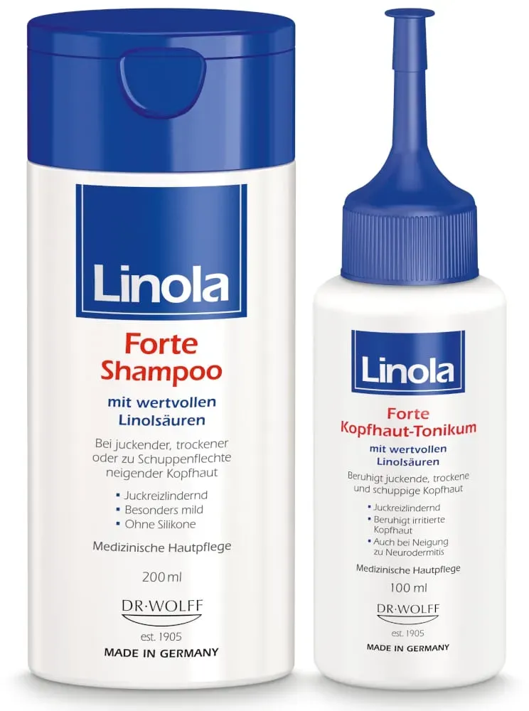 Verfügbarkeit: 2-4 Werktage - Kategorie: Medizinische Körperpflege - Dr. Wolff - Anwendungsgebiet von Linola Forte: Shampoo (200 ml) und Kopfhaut-Tonikum (100ml) Linola Forte Shampoo (200 ml): Linola Forte Shampoo reinigt schonend trockene und juckende Kopfhaut. Linola Forte Kopfhaut-Tonikum (100 ml): Das Linola Forte Kopfhaut-Tonikum ist eine speziell entwickelte Pflege für trockene, juckende und irritierte Kopfhaut. Es hilft, die natürliche Schutzbarriere der Kopfhaut zu regenerieren und deren Feuchtigkeitshaushalt zu stabilisieren. Das Tonikum enthält wertvolle Pflanzenöle mit hohem Gehalt an Linolsäure, einem natürlichen Baustein für die Strukturlipide der Haut, und wirkt damit effektiv gegen Spannungsgefühle, Schuppenbildung und Juckreiz.Zusätzlich unterstützt der enthaltene Extrakt aus der Echinacea-Wurzel mit seinen leicht entzündungshemmenden Eigenschaften den Erholungsprozess der Haut. Das Linola Forte Kopfhaut-Tonikum beruhigt nachhaltig, stärkt die natürliche Barriere und schützt vor weiteren Schäden durch Umwelteinflüsse oder Austrocknung.Besonders geeignet ist Linola Forte Kopfhaut-Tonikum, um den Juck-Kratz-Kreislauf zu durchbrechen, der durch trockene Kopfhaut ausgelöst wird. Bereits bei den ersten Anzeichen von Spannungsgefühlen, Schuppen oder Juckreiz kann das Tonikum helfen, die Kopfhaut zu beruhigen und weiteren Beschwerden vorzubeugen. Ideal für eine intensive und nachhaltige Pflege bei trockener Kopfhaut.Wirkungsweise von Linola ... Dieses Sparset von Sanicare Apotheke bietet Shampoo und Tonikum zu einem guten Preis. ![]() ![]() Dr. Wolff Linola Forte Shampoo & Linola Forte Kopfhaut-Tonikum 1 Sparset