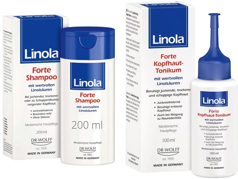 Verfügbarkeit: 1-2 Werktage - Kategorie: Medizinische Körperpflege - Dr. Wolff - Anwendungsgebiet von Linola Forte: Shampoo (200 ml) und Kopfhaut-Tonikum (100ml) Linola Forte Shampoo (200 ml): Linola Forte Shampoo reinigt schonend trockene und juckende Kopfhaut. Linola Forte Kopfhaut-Tonikum (100 ml): Das Linola Forte Kopfhaut-Tonikum ist eine speziell entwickelte Pflege für trockene, juckende und irritierte Kopfhaut. Es hilft, die natürliche Schutzbarriere der Kopfhaut zu regenerieren und deren Feuchtigkeitshaushalt zu stabilisieren. Das Tonikum enthält wertvolle Pflanzenöle mit hohem Gehalt an Linolsäure, einem natürlichen Baustein für die Strukturlipide der Haut, und wirkt damit effektiv gegen Spannungsgefühle, Schuppenbildung und Juckreiz.Zusätzlich unterstützt der enthaltene Extrakt aus der Echinacea-Wurzel mit seinen leicht entzündungshemmenden Eigenschaften den Erholungsprozess der Haut. Das Linola Forte Kopfhaut-Tonikum beruhigt nachhaltig, stärkt die natürliche Barriere und schützt vor weiteren Schäden durch Umwelteinflüsse oder Austrocknung.Besonders geeignet ist Linola Forte Kopfhaut-Tonikum, um den Juck-Kratz-Kreislauf zu durchbrechen, der durch trockene Kopfhaut ausgelöst wird. Bereits bei den ersten Anzeichen von Spannungsgefühlen, Schuppen oder Juckreiz kann das Tonikum helfen, die Kopfhaut zu beruhigen und weiteren Beschwerden vorzubeugen. Ideal für eine intensive und nachhaltige Pflege bei trockener Kopfhaut.Wirkungsweise von Linola ... Dieses Set aus Shampoo und Tonikum ist ein gutes Kombi-Angebot zu einem attraktiven Preis. ![]() ![]() Dr. Wolff Linola Forte: Shampoo (200 ml) und Kopfhaut-Tonikum (100ml)