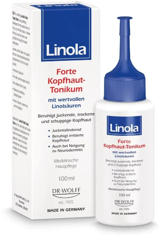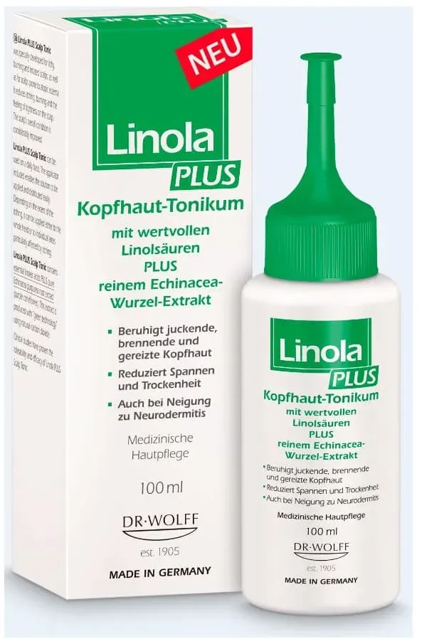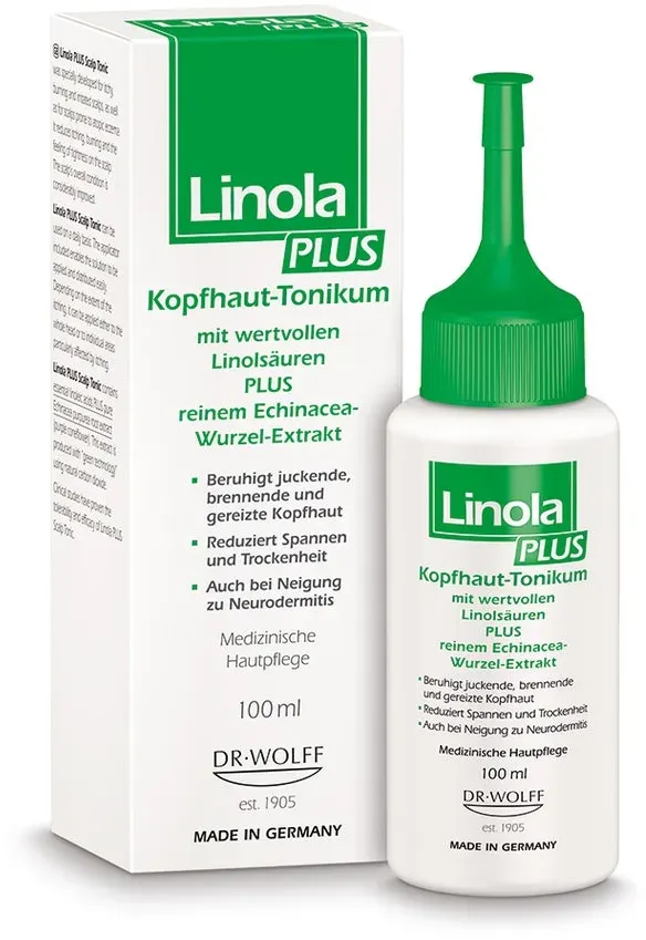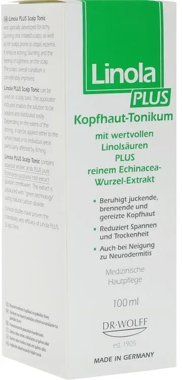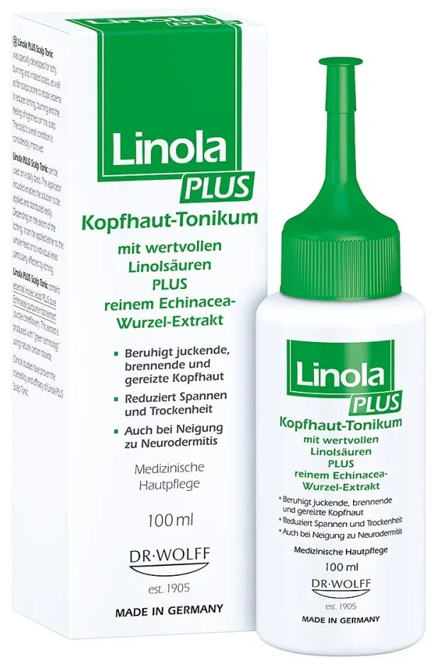 Verfügbarkeit: Lieferbar in 1-2 Werktagen - 134,20 €/l - Kategorie: Arzneimittel - Dr. Wolff - GTIN:4048882249502 - PZN:17556836 - Linola Forte Kopfhaut-Tonikum - Kopfhautpflege bei Juckreiz und TrockenheitEffektive Linderung: Reduziert Juckreiz, Schuppenbildung und trockene Kopfhaut.Speziell für sensible Kopfhaut: Ideal auch bei Neigung zu Neurodermitis.Natürliche Inhaltsstoffe: Enthält Linolsäure-reiche Pflanzenöle und Echinacea-Wurzel-Extrakt.Wirksamkeit und Verträglichkeit klinisch bestätigt: Ohne Silikone, Mineralöle und Mikroplastik.Für alle Altersgruppen: Geeignet für Erwachsene und Kinder ab . Haartonikum für juckende, trockene und schuppige KopfhautEine gesunde Kopfhaut ist entscheidend für starkes und gesundes Haar. Doch häufige Probleme wie trockene Kopfhaut, Schuppenflechte und Juckreiz können das Wohlbefinden beeinträchtigen. Diese Probleme entstehen oft durch eine gestörte Hautschutzbarriere, die zu Feuchtigkeitsverlust und Entzündungen führen kann. Dies kann durch Umweltfaktoren, häufiges Waschen oder genetische Faktoren wie Neigung zu Neurodermitis verstärkt werden. Das Linola Forte Kopfhaut Tonikum bietet eine gezielte Lösung für diese Probleme. Es beruhigt die Kopfhaut und fördert den natürlichen Erholungsprozess. Die einzigartige Formel mit Linolsäure-reichen Pflanzenölen stärkt die Hautschutzbarriere und vermindert Trockenheit sowie Schuppenbildung. Der enthaltene Echinacea-Wurzel-Extrakt bietet zusätzlichen Schutz gegen ... Dieses Angebot ist das günstigste für das Linola PLUS Kopfhaut-Tonikum und somit ideal für preisbewusste Käufer. ![]() ![]() Dr. Wolff Linola PLUS Kopfhaut-Tonikum