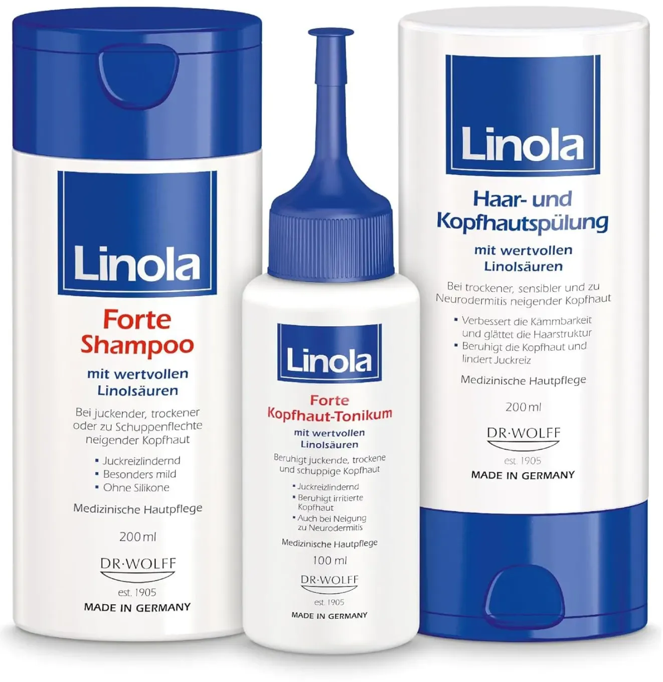 Verfügbarkeit: sofort lieferbar - 76.78 € / 1 Liter - Kategorie: Arzneimittel - Dr. Wolff - GTIN:4255613608273 - PZN:81921408 - Das Set enthält: 2x PZN 08768976 Linola Forte Shampoo - Für juckende Kopfhaut Das beruhigende Linola Forte Shampoo wurde speziell für die schonende Reinigung von Haaren und juckender, trockener oder zu Schuppenflechten neigender Kopfhaut entwickelt. Diese Haut reagiert auf eine zu intensive oder häufige Reinigung mit verstärkten Reizungen. Dies führt zu mehr Juckreiz, Rötungen, Trockenheit, Spannungsgefühl und Schuppenbildung. Daher wurden diese Aspekte bei der Entwicklung von Linola Forte Shampoo speziell berücksichtigt, wie auch klinische Studien bestätigten. ? Das glasklare Gel mit dem hautphysiologischen pH-Wert von 5,5 reinigt die trockene Kopfhaut und die Haare mit ausgewogenen, milden Wasch-Substanzen extra sanft und hautschonend. ? Das innovative Mikroemulsions-System versorgt die trockene Kopfhaut mit wertvollen Linolsäurereichen Pflanzenölen. So wird die Hautschutzbarriere geschont und die für die Geschmeidigkeit der Haut erforderliche Wasserbalance wird bewahrt und gefördert. Diese führt zu einer deutlichen Abnahme der Hauttrockenheit, des Hautspannens und der Schuppenbildung. ? Kühlendes Menthol und ein spezieller Pflanzenextrakt sorgen für Juckreizlinderung der trockenen Kopfhaut. ? Selbstverständlich ohne Silikone, Mineralfette, Parabene und Cocamidopropylbetain. Deshalb kann das milde Linola Forte Shampoo wie ... Ein umfassendes Pflege-Set mit Shampoo und Tonikum, das eine gute Lösung für trockene und juckende Kopfhaut darstellt. ![]() ![]() Dr. Wolff Linola Forte Shampoo + Forte Kopfhaut-Tonikum - 200 ml + 100 ml - Pflege-Set gegen trockene Kopfhaut und Schuppenflechte - Haarshampoo und Haarwasser gegen Juckreiz