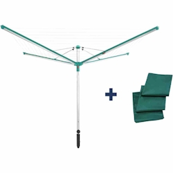 Kategorie: Wäschespinnen - Leifheit - GTIN:4006501820082 - Automatischer Leineneinzug - Für saubere Leinen und sauberes Wäsche trocknen sorgt die Leinenautomatik, die Wäscheleine zieht sich einfach in die Tragarme ein Einfaches öffnen - Der Wäschetrockner für die ganze Familie lässt sich durch das Easy Lift System leicht öffnen und bietet auf 60 m Leinen Platz für ca. sechs Wäscheladungen Schutzhülle - die Schutzhülle schützt die Wäscheleinen das ganze Jahr vor möglichen Schäden. Dank strapazierfähiger Materialien bleibt die Schutzhülle über mehrere Jahre in hervorragender Qualität Acht Kleiderbügelhalter - Auf acht Bügelhaltern trocknet Kleidung faltenfrei und mit max. 2,20 m Leinenlänge ist das Wäsche trocknen von großen Wäschestücken kein Problem Strom sparen im Haushalt - das natürliche Trocknen ohne Strom mit der Leifheit Wäschespinnen ist nicht nur energiesparend, sondern schont auch die Umwelt und Wäsche Praktischer Lieferumfang - Leifheit Wäschespinne Linomatic 600 Deluxe Cover inkl. Schutzhülle und Bodenhülse zum Einbetonieren mit 60 m Wäscheleine, Made in Germany, Artikelnummer 82008 - 154,99 Euro bei Amazon Marketplace Home - gefunden von billiger.de ![]() ![]() Wäscheschirm Linomatic 600 deluxe Cover - Leifheit