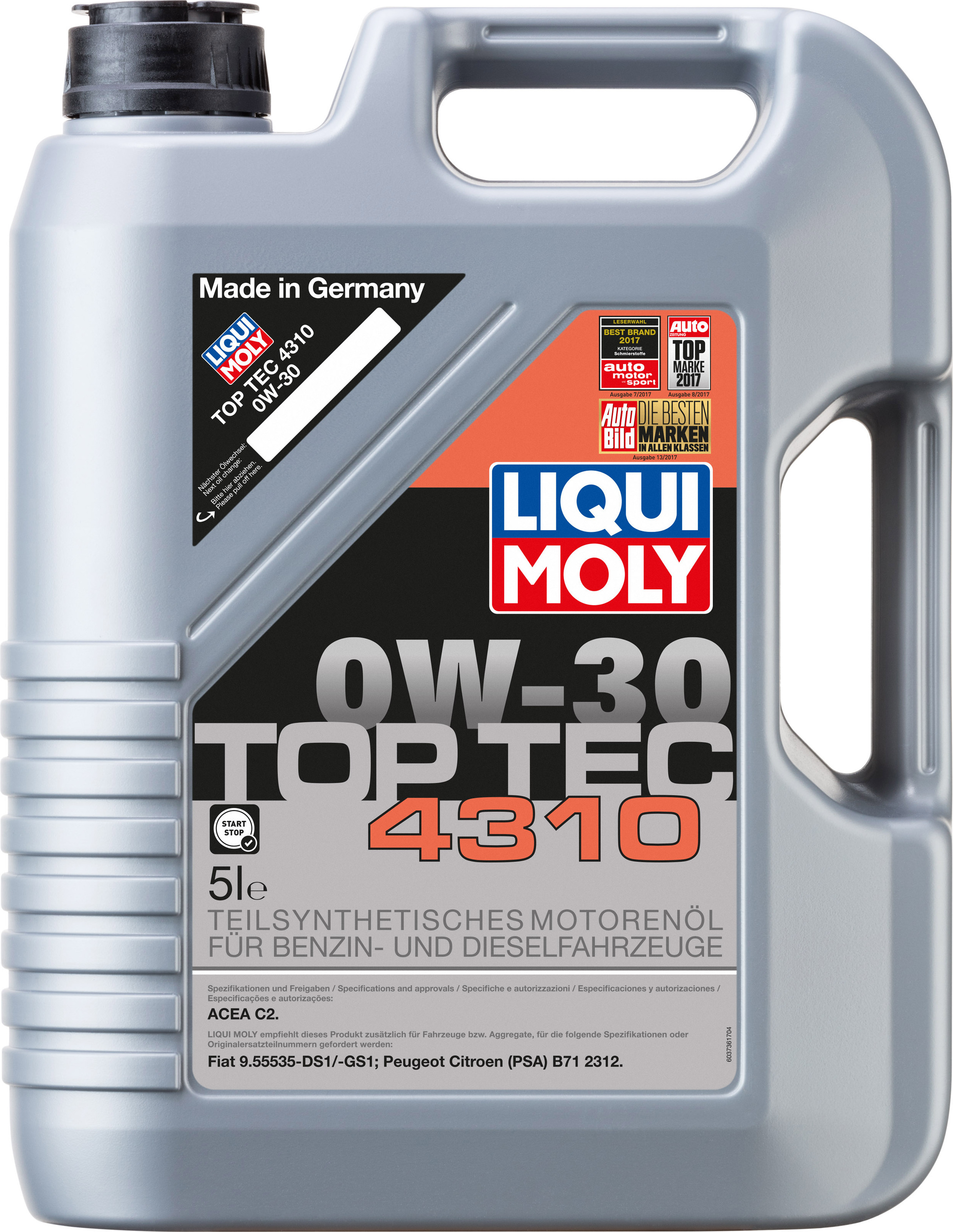 Kategorie: Motoröle - LIQUI MOLY - GTIN:4100420037368 - Spezifikationen/Freigaben: ACEA C2 | Peugeot Citroen (PSA) B71 2312 Empfehlungen: Fiat 9.55535-DS1/9.55535-GS1 ölart: Synthesetechnologie enorme Kraftstoffersparnis schnelle Durchölung geeignet für Dieselpartikelfilter exzellente Hochdruck- und Verschleißschutzeigenschaften exzellenter Korrosionsschutz leichter Motorlauf - 53,68 Euro bei Amazon Marketplace Automotive - gefunden von billiger.de Dieses Angebot ist mit 53,70 Euro ebenfalls sehr preiswert für 5 Liter des Motoröls und bietet eine gute Alternative zum günstigsten Angebot. ![]() ![]() Motoröl LIQUI MOLY 3736 Top TEC 4310 0W-30 Motorenöl Leichtlauf Motor öl 5 Liter