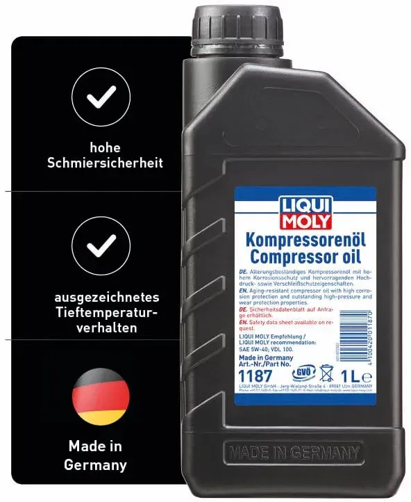 Liqui Moly - EAN: 4100420011870 - Modernes Leichtlauföl das speziell für die ganzjährige Verwendung in Luftverdichtern entwickelt wurde. Die Kombination unkonventioneller Grundöle mit einer ausgewählten Additivtechnologie sorgt für ein Verdichteröl, welches den Kompressor optimal mit öl versorgt, über hervorragende Hochdruck- und Verschleißschutzeigenschaften verfügt und durch den ausgezeichneten Korrosionsschutz eine lange Lebensdauer des Verdichters gewährleistet. - bei voelkner.de - aus Yadore Produktdaten ![]() ![]() Liqui-Moly Kompressorenöl 1187, 1 Liter