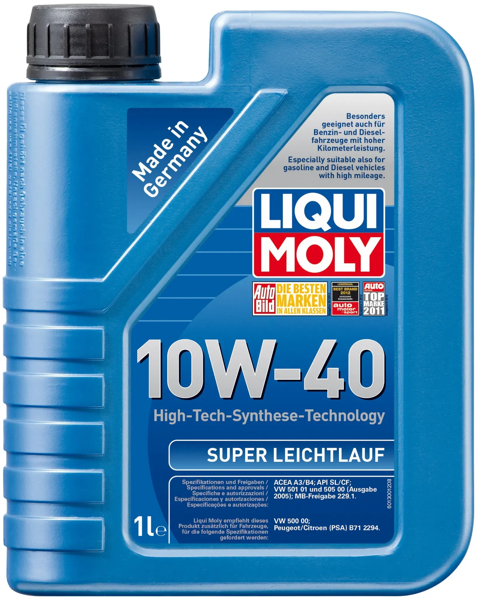 10 Händlerangebote bei billiger.de - Kategorie: Motoröle - LIQUI MOLY - Ganzjahres-Leichtlaufmotoröl auf Basis High Tech Synthesetechnologie. Super Leichtlauf wurde für die höchsten Anforderungen moderner und leistungsstarker Benzin- und Dieselmotoren ohne Wartungsintervallverlängerung (WIV) entwickelt. Turbo- und Kat-geprüft. Spart Kraftstoff und schützt optimal vor Verschleiß. Die Formulierung wirkt sich positiv auf Dichtungsmaterialien, und somit auf die Dichtheit der Motoren aus. Somit eignet sich Super Leichtlaufmotoröl hervorragend für Fahrzeuge mit Laufleistungen über 100.000 km. - GTIN:4100420013003 Ein weiteres günstiges 1-Liter-Angebot, perfekt für den gelegentlichen Gebrauch. ![]() ![]()