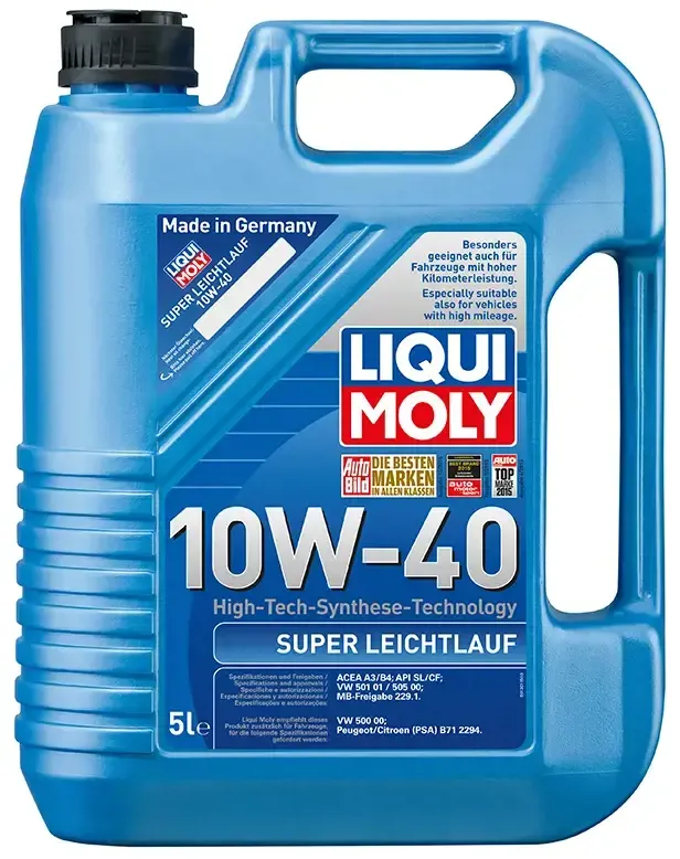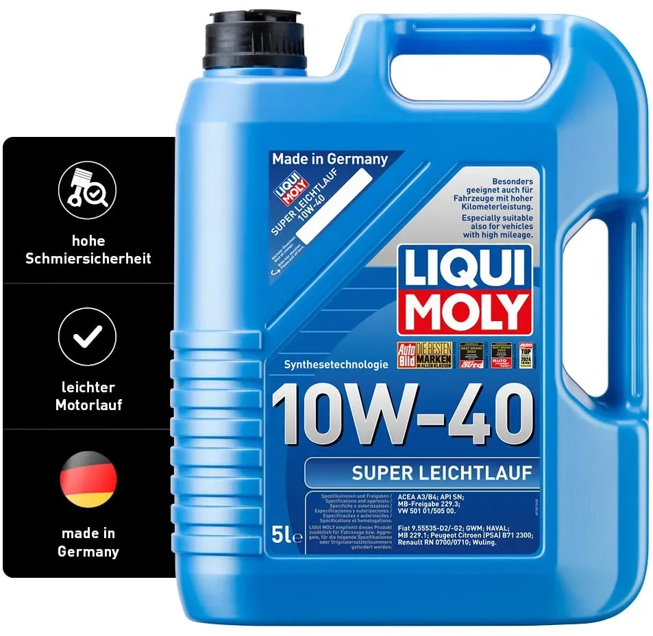 7,45 / 1l - Kategorie: Motoröle - LIQUI MOLY - GTIN:4100420013010 - Besonders geeignet für Fahrzeuge mit hoher Kilometerleistung. Synthese Technologie Leichtlaufmotorenöl. Besonders gutes Schmutztrage und Reinigungsvermögen. Verhindert die Bildung von Schwarzschlamm. Mit modernster Verschleißschutztechnologie. Hält Motordichtungen wie z.B. Wellendichtringe und Ventilschaftabdichtungen elastisch und sorgt für einen geringen ölverbrauch. Für Fahrzeuge mit bewährter Motorentechnologie. Ganzjahresöl für Benzin und Dieselmotoren. Turbo und Kat getestet.Bitte beachten Sie die Herstellervorschriften ( Freigaben / Spezifikationen ) - die Angaben entnehmen Sie der Betriebsanleitung in Ihrem Fahrzeughandbuch. - 37,25 Euro bei reifencom - gefunden von billiger.de Ein 5-Liter-Gebinde zu einem fairen Preis, das eine gute Menge für den durchschnittlichen Bedarf bietet. ![]() kaufland.d e LIQUIMOLY Liqui Moly Super Leichtlauf 10W 40 Hochwertiges PKW Motorenöl 5L r107765