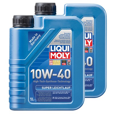 Auto Motorrad Lifestyle - - Gebindeart: Flasche; Inhalt [Liter]: 1; Viskositätsklasse SAE: 10W-40; Fahrzeugtyp: Auto; Spezifikation: ACEA A3/B4, API SN, API CF; Herstellerempfehlungen: MB 229.1, MB 229.3, VW 501 01, VW 505 00, PSA B71 2300, Fiat 9.55535-D2, Fiat 9.55535-G2, Renault RN0700, Renault RN0710; Produktreihe: Leichtlauf; Modell: Super; öl: Teilsynthetiköl; ACEA: ACEA A3/B4; API: API SN, API CF; P000315; Motorenöl,öl,öl für Motor - Versandkostenfrei: false - product_flag_accessory_lifestyle: true - Lieferzeit: 4 Tage - Sofort verfügbar: true - - - Zahlungsoptionen: Rechnung - bei Autodoc - gefunden von shopping24 Dieses 2x 1L Paket ist eine gute Option, wenn man etwas mehr als einen Liter benötigt und dabei sparen möchte. ![]() Liqui Moly 2x 1 L Super Leichtlauf 10W-40 [Hersteller-Nr. 1300]