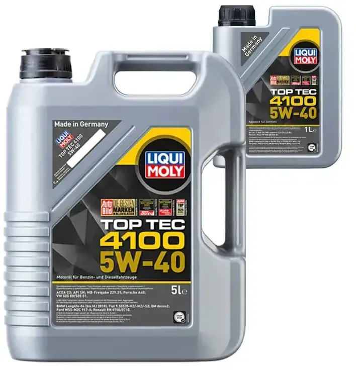 Verfügbarkeit: 2-5 Werktage - 7,34 € / 1l - Kategorie: Motoröle - LIQUI MOLY - GTIN:4100420037016 - Schwefelreduziert zum Schutz der Umwelt und des Rußpartikelfilters. Synthese Technologie Leichtlaufmotorenöl mit extrem hoher Leistungsreserve. Mit hervorragender Verschleißschutzformel für Pumpe Düse Motoren. Vermindert öleindickung durch Russeintrag. Für höchste Motorleistung. Sichert die Funktionsfähigkeit des Dieselpartikelfilters ( DPF ) und sorgt für maximale Lebensdauer. Gewährleistet selbst bei langen ölwechselintervallen ( bis zu 30.000 km ) die maximale Performance. Ganzjahresöl für Benzin und Dieselmotoren einschließlich Common-Rail- und Pumpe Düse Technologie. Besonders geeignet für gasbetriebene Fahrzeuge ( CNG/LPG ) und Fahrzeuge mit Dieselpartikelfilter ( DPF ) – auch bei Nachrüstung. Turbo und Kat getestet.Bitte beachten Sie die Herstellervorschriften ( Freigaben / Spezifikationen ) - die Angaben entnehmen Sie der Betriebsanleitung in Ihrem Fahrzeughandbuch. - 36,69 Euro bei reifencom - gefunden von billiger.de Dieses Angebot für 5 Liter ist sehr preiswert und gut für einen vollständigen Ã-lwechsel. ![]() ![]() LIQUI MOLY Top Tec 4100 5W-40 5 l