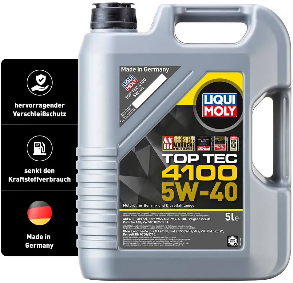 Liqui Moly Top Tec 4100 5W-40 ist ein synthetisches Mehrbereichsöl für moderne Benzin- und Dieselmotoren. Es ist besonders geeignet für Fahrzeuge mit: Wichtige Freigaben: