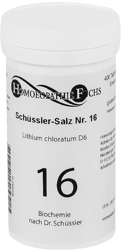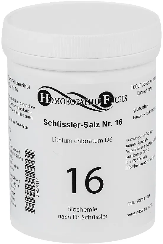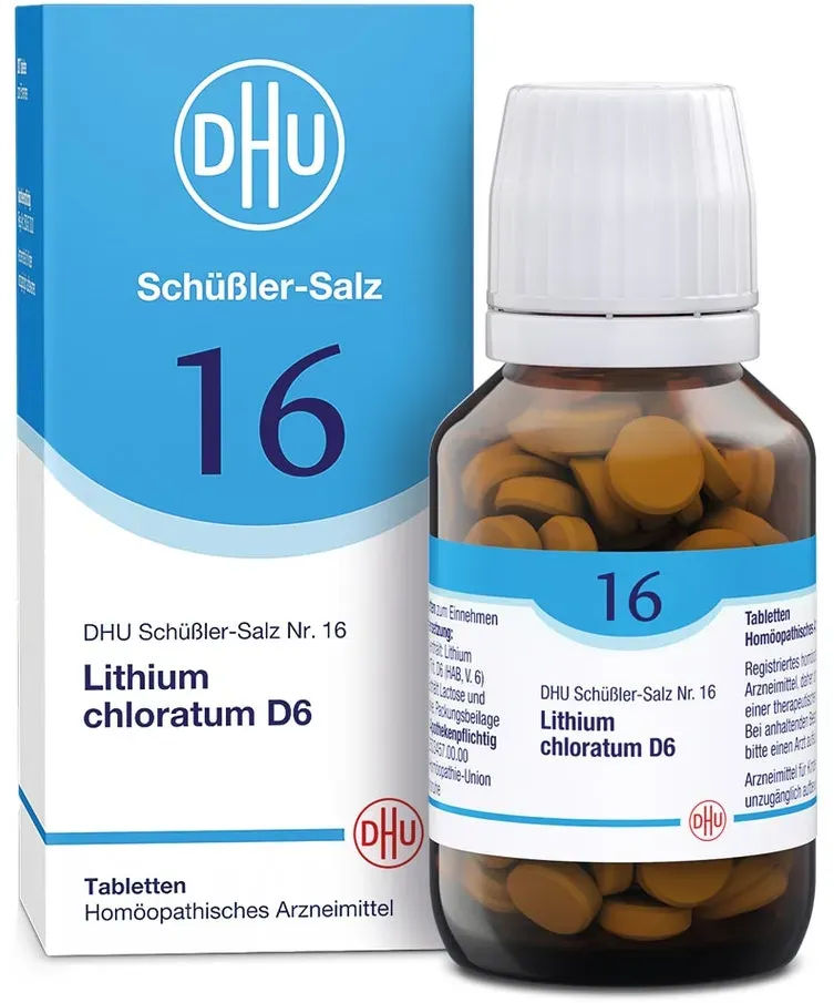 Verfügbarkeit: sofort lieferbar - 0.02 € / 1 Stück - Kategorie: Arzneimittel - Homöopathiefuchs - PZN:81888869 - Schüssler Salz Nr. 16 400St. von Homöopathiefuchs Lithium chloratum D6 Apothekenpflichtig Zusammensetzung: 1 Tablette enthält den Wirkstoff: Lithium chloratum Trit. D6 250mg Sonstige Bestandteile: Lactose-1-Wasser, Magnesiumdistearat, Kartoffelstärke Apothekenpflichtig. - 7,45 Euro bei Sanicare Apotheke - gefunden von billiger.de Dieses Angebot von DHU ist eine beliebte Wahl für Tabletten und bietet eine gute Balance aus Preis und Markenqualität. ![]() ![]() DHU Schüßler-Salz Nr. 16 Lithium chloratum D6 ? Das Mineralsalz der inneren Reinigung ? das Original ? umweltfreundlich im Arzneiglas, 200 St. Tabletten