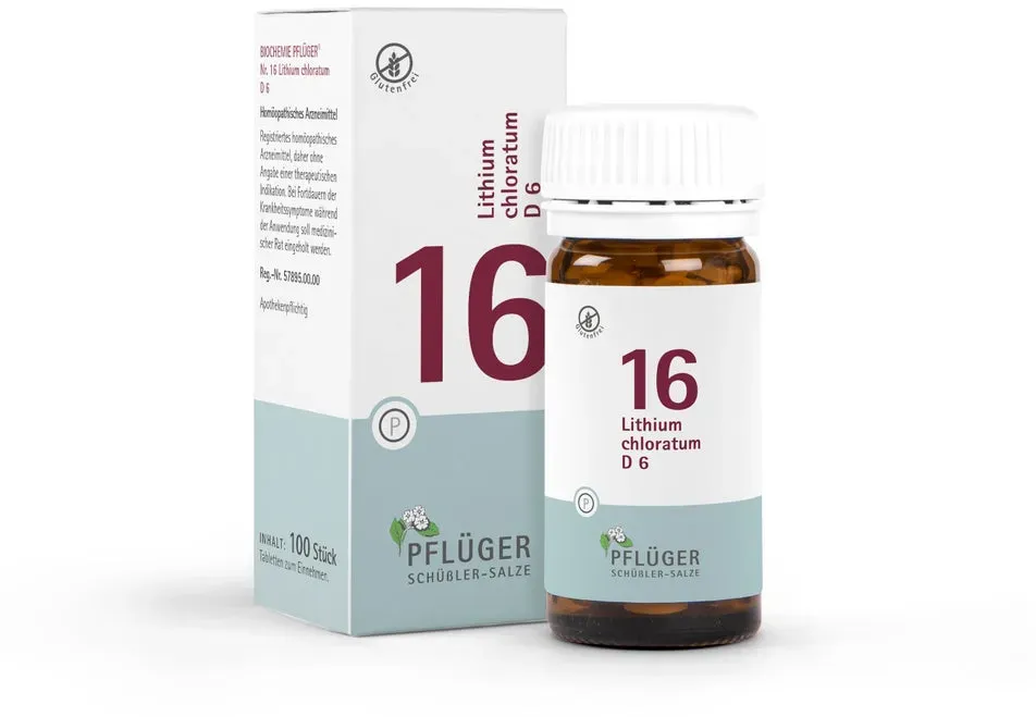 Verfügbarkeit: in 1 bis 2 Werktagen lieferbar - 0.04 € / 1 Stück - Kategorie: Arzneimittel - Homöopathisches Laboratorium Alexander Pflüger GmbH & Co. KG - GTIN:4150063222881 - PZN:06322288 - Zusammensetzung: 1 Tablette enthält: Wirkstoff: Lithium chloratum Trit. D6 250 mg. Sonstige Bestandteile: Calciumbehenat (DAB), Kartoffelstärke. Registriertes homöopathisches Arzneimittel, daher ohne Angabe einer therapeutischen Indikation. Gegenanzeigen/Nebenwirkungen: keine bekannt. Enthält Lactose. Packungsbeilage beachten. Homöopathisches Laboratorium Alexander Pflüger GmbH & Co. KG · 33378 Rheda-Wiedenbrück · info@pflueger.de · www.pflueger.de**Strahlendes Aussehen, erholsamer Schlaf, sprudelnde Vitalität: Gesundheit, Wohlbefinden und Leistungsfähigkeit sind für unseren Körper untrennbar mit einer ausgewogenen Mineralstoff-Versorgung verknüpft.**Das wusste auch **Dr. Wilhelm Heinrich Schüßler** und entwickelte bereits vor 14 n eine Heilmethode, die auf zwölf homöopathisch aufbereiteten Mineralstoffen basiert. Die nach ihm benannten Schüßler-Salze sind natürlich wirksam und nebenwirkungsfrei. Sie können problemlos mit anderen Präparaten eingenommen werden und sind für jedes Alter geeignet. Als **Weiterentwicklung der Therapie nach Dr. Schüßler** haben sich mit der Zeit weitere Mineralstoffverbindungen bewährt. Diese **Ergänzungsmittel** können die Einnahme der 12 Basissalze optimieren, aber auch einzeln angewendet werden. Die bunten ... Dieses Angebot ist das günstigste für 100 Tabletten auf Amazon und bietet eine bequeme Bestelloption. ![]() ![]() PFLÜGER Schüßler Salze Nr. 16 Lithium chloratum D6-100 Tabletten - Das Ergänzungsmittel der Nerven und Gelenke - glutenfrei?