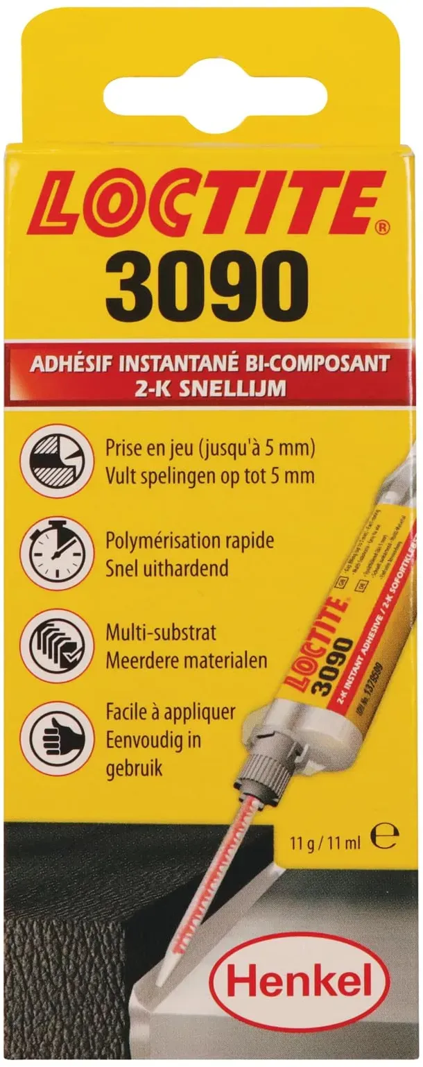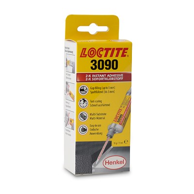 Kategorie: Klebeprodukte - LOCTITE - GTIN:5010266001340 - Sofortklebstoff (2K) LOCTITE 3090 (inkl. 7 Mischdüsen) 10g Doppelkartusche - 31,30 Euro bei emax-haustechnik.de - gefunden von billiger.de Für 32,99 Euro erhalten Sie hier den Loctite 3090 Sofortklebstoff in der 11ml-Variante. ![]() ![]() Loctite 11ml 3090 Sofortklebstoff [Hersteller-Nr. 1379599]