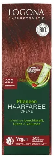 Auf Lager Versand durch AmazonLOGONA Naturkosmetik Pflanzen-Haarfarbe Creme 220 Weinrot, Rote Natur Haarfarbe mit Henna, vegane Farbcreme für eine dauerhafte Coloration, schonende Färbung für glänzendes Haar, 150ml