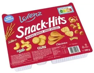 Zustand: Neu - 13,54 € / kg - Party-Mix - Lorenz Snack World The Lorenz Bahlsen Snack-World GmbH & Co KG Germany - - EAN: 4018077010323 - Snack-Hits ist die Knabbermischung mit sechs unterschiedlichen Produkten unserer beliebten Marken Saltletts, NicNac€™s, ErdnußLocken, Chipsletten, Pommels und Clubs. Der ultimative Knabber-Mix! Die große Vielfalt der Lorenz Marken in einer Packung. Probiere Deutschlands beliebteste Knabbermischung, die für alle etwas leckeres bereithält. Im praktischen Serviertray: einfach öffnen, servieren und die Snackvielfalt genießen. - bei Amazon.de ![]() ![]() LORENZ | Snack-Hits | 16 x 280 g | Knabbermischung
