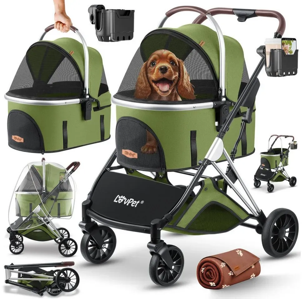 lieferbar-in 2-3 Werktagen bei dirLovpet Hundebuggy 3in1 Hundewagen max. bis 20kg Buggy für Haustiere, (Hundebox & Tasche mit Regenschutzabdeckung Getränkehalter Kuscheldecke), Haustier- & Katzenbuggy faltbar & klappbar, Große Räder & Netzfenster grün