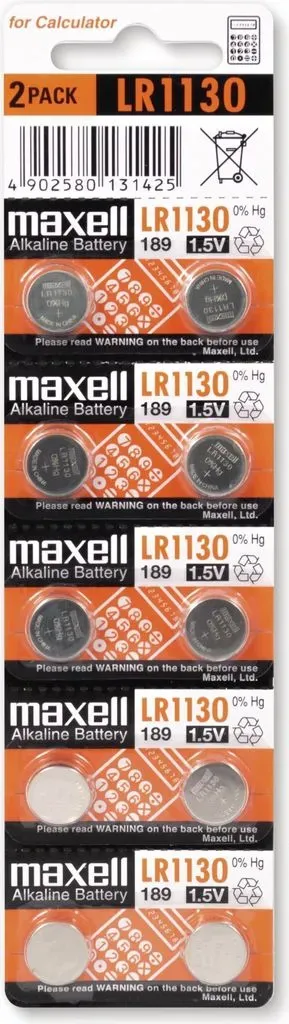 10 Händlerangebote bei billiger.de - Kategorie: Batterien & Akkus - Maxell - Maxell Knopfzellen vom Typ LR1130 sind für eine Vielzahl von elektronischen Anwendungen geeignet, darunter zum Beispiel Fahrzeugschlüssel, Fernbedienungen, Kameras, Spielzeug, Taschenrechner, Uhren und Wecker. Sie kommen in einem 10er Blister. Maxell Knopfzellen vom Typ LR1130 sind quecksilberfrei. Alternative Bezeichnungen: AG10, LR54, LR1130, 189, RW89, V10GA, SR1130, 389, G10, R89Hersteller-Nr: EAN: 4902580131425Hersteller: Maxell Knopfzellen-Typ: LR1130 Produktgruppe: Batterie IEC-Code: LR1130 Technologie: Alkaline Zelle (quecksilberfrei) Spannung: 1,5 V Kapazität: 44 mAh Stückzahl: 10 Stück pro Blister Vorgeladen (ready to use): ja Geeignet für: Uhr, Elektronische Geräte, Fernbedienungen, Taschenrechner Abmessungen: 11,6 x 3,05 mm Akku-/Batterietyp:EinwegbatterieBatteriegröße(n):LR1130Akku-/Batterietechnologie:AlkaliAkku-/Batteri espannung:1,5 VAnzahl enthaltener Akkus/Batterien:10 Stück(e)Schwermetallfrei:Hg (Quecksilber)Produktfarbe:SilberHöhe:3,1 mmDurchmesser:1,16 cmVerpackungsart:Sichtverpackung Sehr hochwertige Knopfzelle, sie eignet sich hervorragend für Computer, Taschenrechner, Kameras, Pulsmesser, Fernbedienungen, usw. Technische Daten: - Baugröße nach IEC: LR1130/LR54/AG10 - Typ: Alkali-Mangan - Nennspannung: 1,5 V- - Nennkapazität: 44 mAh - Gewicht: 1 g - Höhe: 3,05 mm - Durchmesser: 11,6 mm Lieferumfang: - 10x Knopfzellen - GTIN:4902580131425 ![]() ![]() AG1 AG3 - AG4 AG10 eBay AG11 AG13 LR44 LR1154 LR1130 LR626 Uhren Batterien œ MHD 2031
