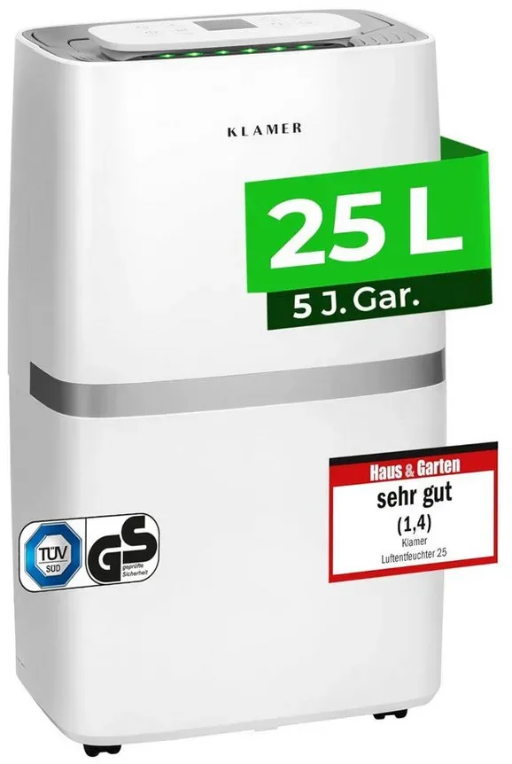 Heizung & Sanitär Luftbefeuchter & Luftentfeuchter Luftentfeuchter - EAN:4060656533389 - Hocheffiziente Luftentfeuchtung: Entfernt bis zu 20 Liter Wasser pro Tag, ideal für Räume bis zu 22 m², dieser elektrische Raumentfeuchter sorgt für ein angenehmes Raumklima. Automatische Luftentfeuchtung: Präzise Feuchtigkeitsregelung von 30 bis 80 Prozent für gleichbleibend angenehme Luft mit diesem elektrischen Luftentfeuchter . Trocknungsmodus: Kontinuierlicher Betrieb unabhängig von der Zielfeuchtigkeit, ideal für eine schnelle und intensive Entfeuchtung bei Bedarf mit diesem elektrischen Raumentfeuchter. Wäschetrocknungsmodus: Entfernt überschüssige Feuchtigkeit aus der Kleidung und trocknet sie schneller - sehr praktisch bei feuchtem Wetter mit diesem elektrischen Luftentfeuchter. Benutzerfreundliche Funktionen: Timer bis zu 24 Stunden, automatischer Neustart nach Stromausfällen und automatisches Schwenken für gleichmäßige Luftverteilung machen diesen elektrischen Luftentfeuchter ideal. Der Klarstein DryFy 20L Entfeuchter sorgt für eine optimale Luftfeuchtigkeit und ein - gefunden von Kelkoo Dieser Klamer Luftentfeuchter überzeugt mit einem Smart Sensor und verschiedenen Modi, inklusive Nachtmodus, für eine präzise Feuchtigkeitskontrolle. ![]() ![]() KLAMER Luftentfeuchter Elektrisch 20L, 195m3 Luftumwälzung pro Stunde, 420W starker Raumentf..., Entfeuchtung 20 l/Tag, Timer 1-24h, diverse Modi, Nachtmodus, Feuchtigkeit in 5%-Schritten weiß