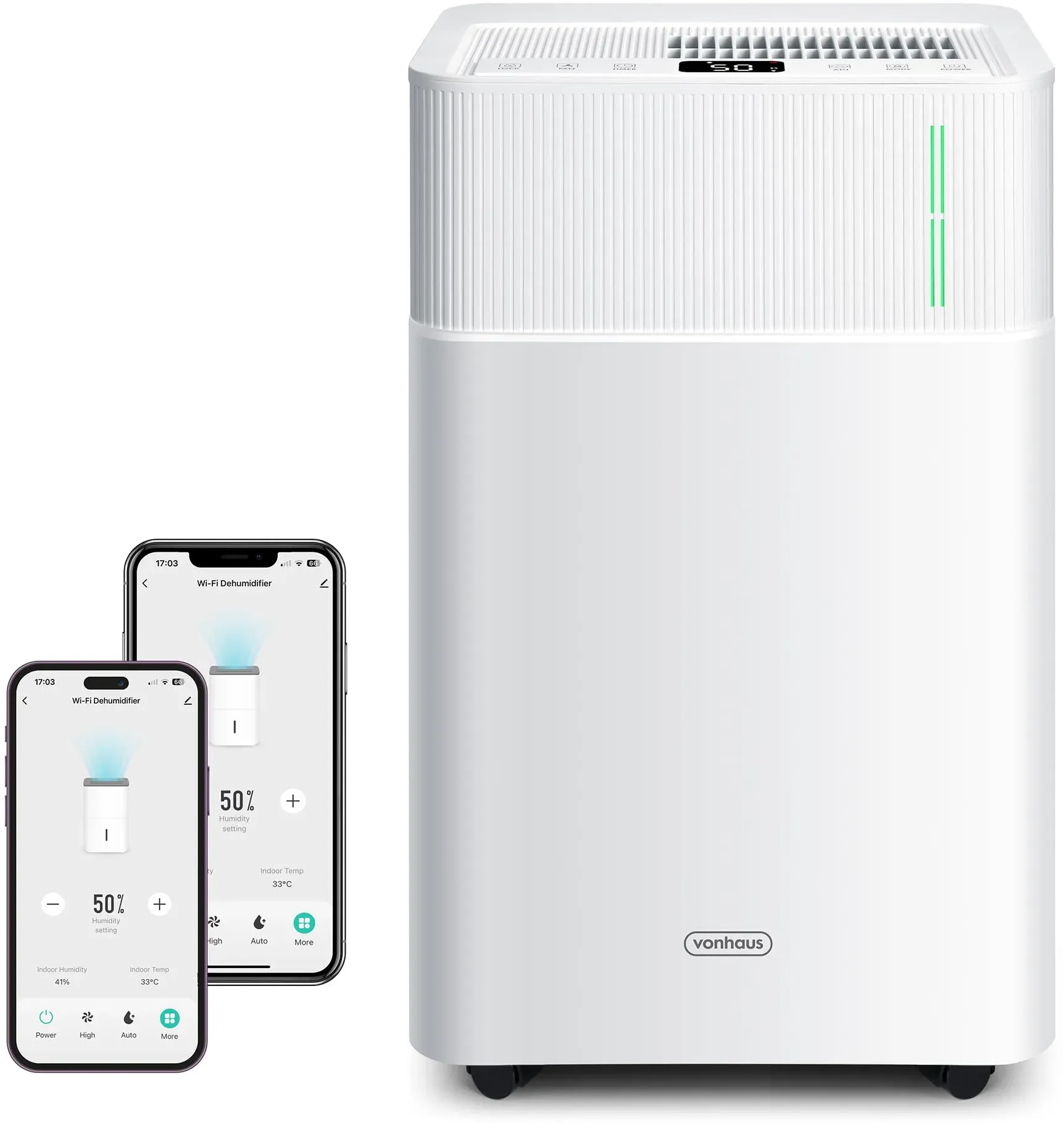 Verfügbarkeit: Auf Lager - Kategorie: Luftentfeuchter - Pro Breeze - GTIN:8438639002164 - Hohe Effizienz: Der Luftentfeuchter mit Kompressor entfernt bis zu 20 Liter Wasser am Tag (195m3/h)dank 5,5 Liter Wassertank Kapazität und ist ideal zum Bekämpfen von Schimmel, Nässe und Feuchtigkeit in großen Räumen wie Keller, Waschküchen, Badezimmer oder Wohnzimmer. Feuchtigkeitssensor: Dank des integrierten Sensors können Sie das gewünschte Feuchtigkeitslevel (30-80 %) im Raum einstellen. Sobald die angestrebte Raumfeuchte erreicht ist, schaltet sich das Entfeuchtungsgerät automatisch ab um Energie zu sparen. Bitte beachten Sie: Der Entfeuchter erreicht seine optimale Leistung bei Raumtemperaturen von 5 €“ 32 °C. Digitale Anzeige: Auf dem modernen LED Display mit Touchscreen wird die aktuelle Raumfeuchtigkeit angezeigt. Zusätzlich lassen sich vier verschiedene Betriebsarten einstellen: Betriebsgeschwindigkeit, Wäschetrocknung, Automatischer Abtaumodus, Kindersicherung. Kontinuierlicher Ablauf: Mit dem optionalen Wasserablaufschlauch ist es möglich einen permanenten Wasserablauf einzurichten. Dies bietet sich insbesondere in sehr feuchten Kellerräumen an oder wenn man das leistungsstarke Gerät als Bautrockner verwendet. Eingebaute Zeitschaltuhr: Mit dem 24h Timer lässt sich der Entfeuchter energiesparend einstellen. Außerdem lässt sich der Lufttrockner dank der 4 angebrachten Rollen sehr einfach und flexibel bewegen. - 147,24 Euro bei Amazon Marketplace Home ... Ein energieeffizienter und leiser Luftentfeuchter mit App-Steuerung, ideal für Schlafzimmer und Bäder. ![]() ![]()