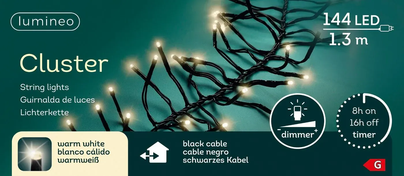 lieferbar-in 2-3 Werktagen bei dirLumineo LED-Lichterkette Lumineo Lichterkette CLUSTER 144 LED 1,3 m warm weiß, schwarzes Kabel, Indoor/Outdoor, dimmbar, 8h-Timer, + 5 m Zuleitung schwarz