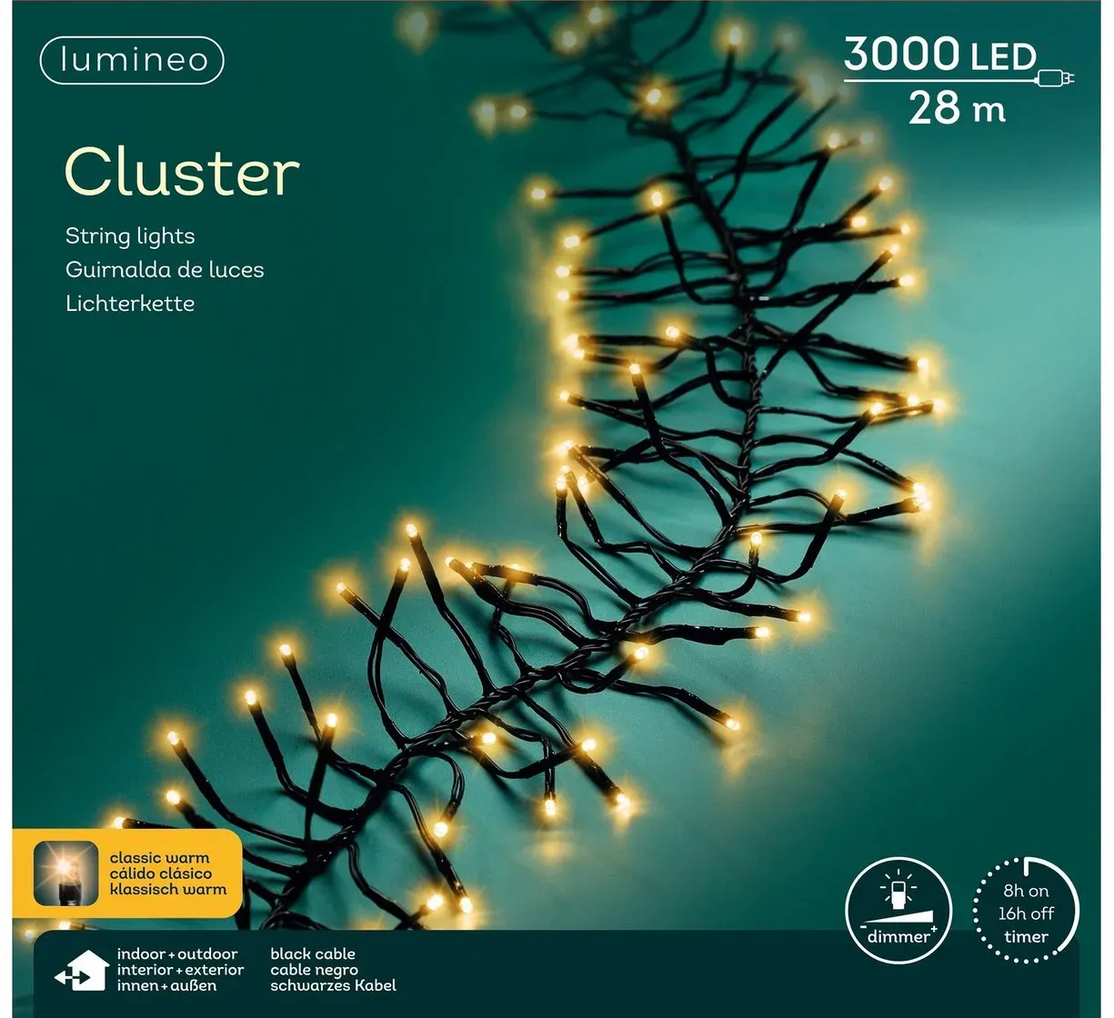 lieferbar-in 2-3 Werktagen bei dirLumineo LED-Lichterkette Lumineo Lichterkette CLUSTER 3000 LED 28 m klassisch warm, schwarz, Indoor/Outdoor, dimmbar, 8h-Timer, + 5 m Zuleitung schwarz