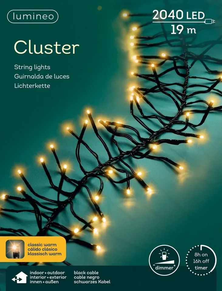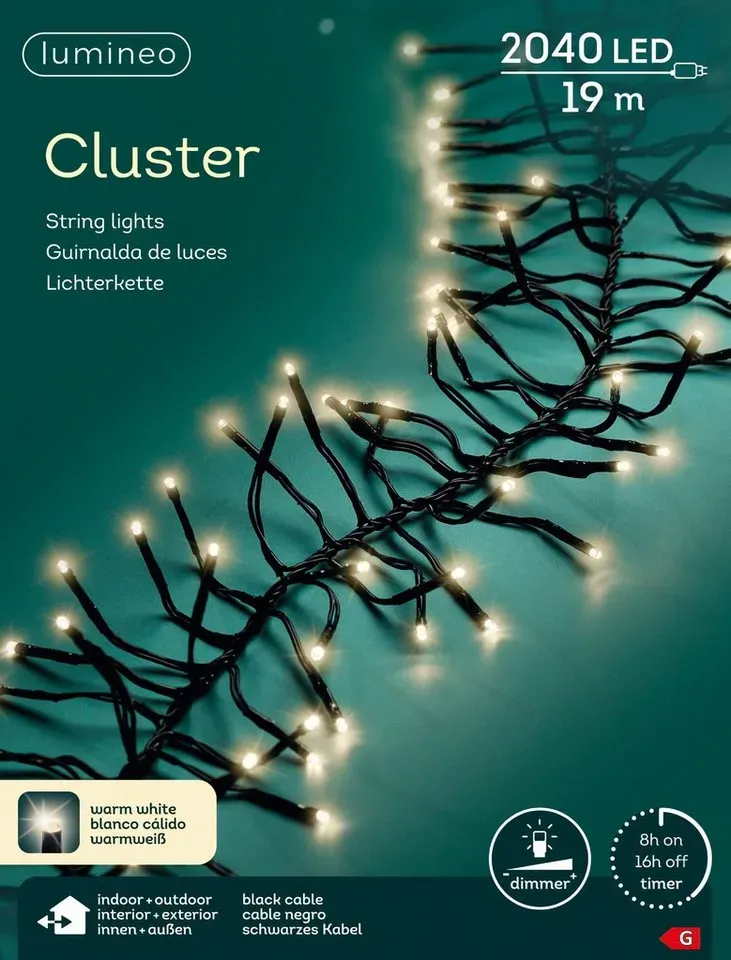 lieferbar-in 2-3 Werktagen bei dirLumineo LED-Lichterkette Lumineo Lichterkette CLUSTER 2040 LED 19 m klassisch warm, schwarz, Indoor/Outdoor, dimmbar, 8h-Timer, + 5 m Zuleitung schwarz