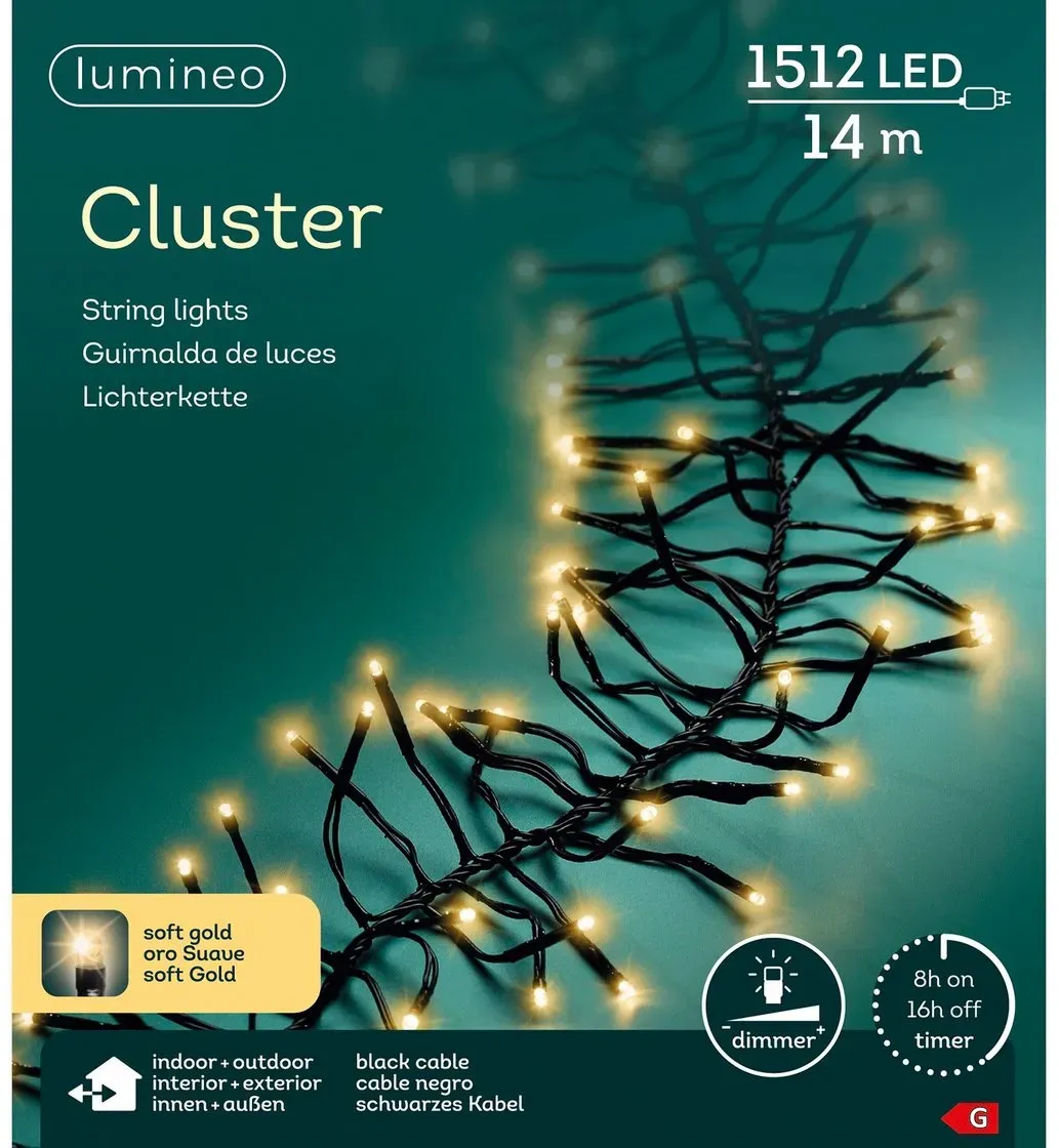 lieferbar-in 2-3 Werktagen bei dirLumineo LED-Lichterkette Lumineo Lichterkette CLUSTER 1512 LED 14 m Soft Gold, schwarzes Kabel, Indoor/Outdoor, dimmbar, 8h-Timer, + 5 m Zuleitung schwarz