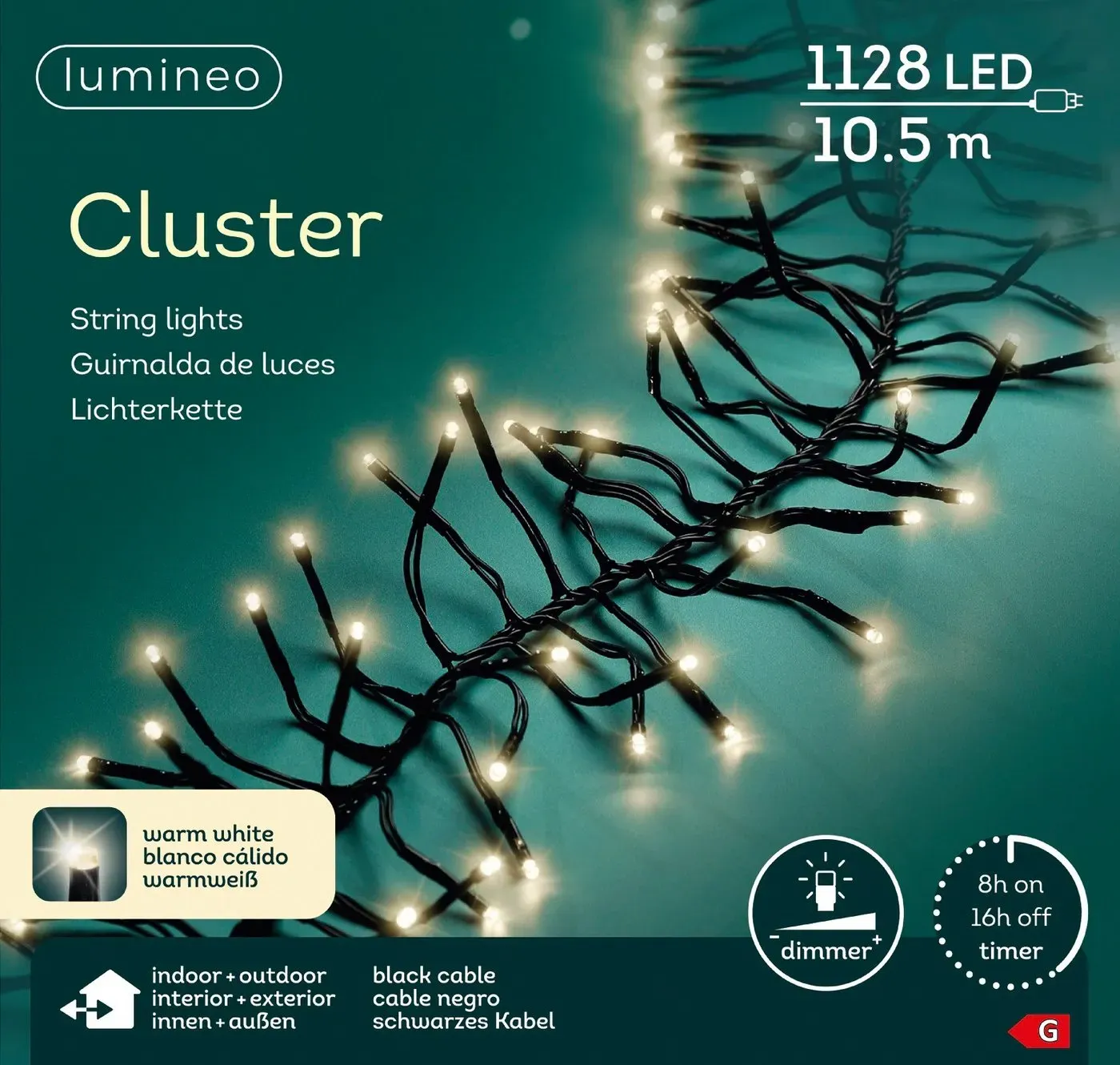 lieferbar-in 2-3 Werktagen bei dirLumineo LED-Lichterkette Lumineo Lichterkette CLUSTER 1128 LED 10,5m warm weiß, schwarzes Kabel, Indoor/Outdoor, dimmbar, 8h-Timer, + 5 m Zuleitung schwarz