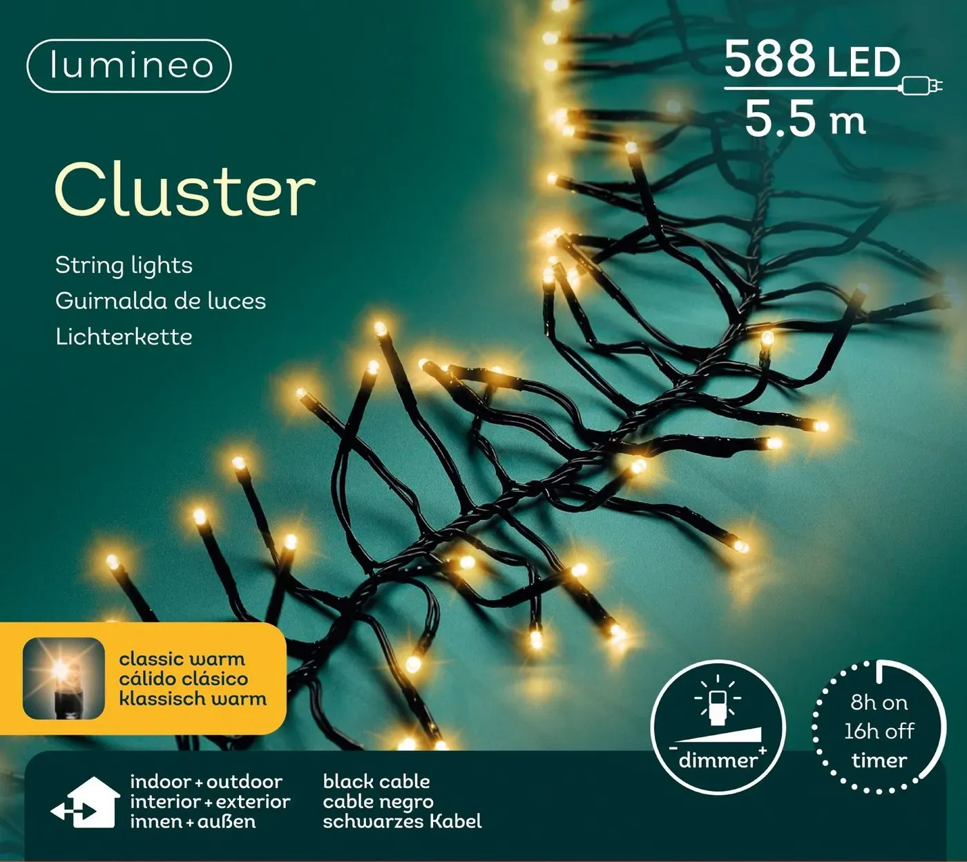 lieferbar-in 2-3 Werktagen bei dirLumineo LED-Lichterkette Lumineo Lichterkette CLUSTER 588 LED 5,5 m klassisch warm, schwarz, Indoor/Outdoor, dimmbar, 8h-Timer, + 5 m Zuleitung schwarz