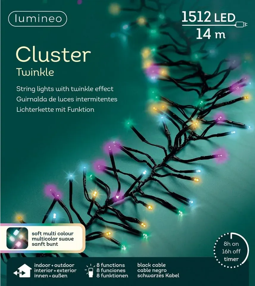 lieferbar-in 3-4 Werktagen bei dirLumineo LED-Lichterkette Lumineo Lichterkette CLUSTER TWINKLE 1512 LED 14m BUNT schwarzes Kabel, Indoor/Outdoor, 8 Effekte, 8h-Timer, + 5 Meter Zuleitung bunt