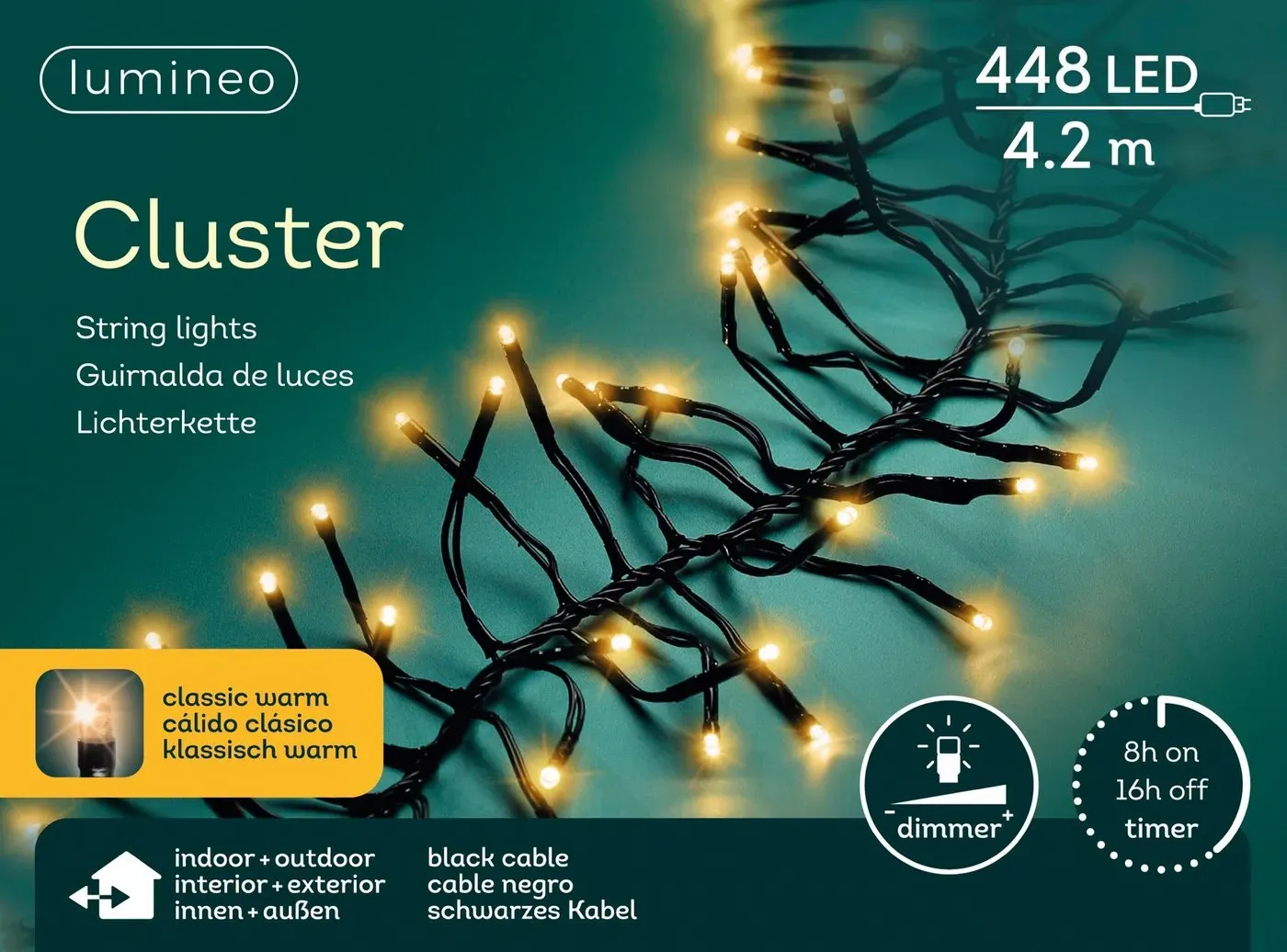 lieferbar-in 2-3 Werktagen bei dirLumineo LED-Lichterkette Lumineo Lichterkette CLUSTER 448 LED 4,2 m klassisch warm, schwarz, Indoor/Outdoor, dimmbar, 8h-Timer, + 5 m Zuleitung schwarz