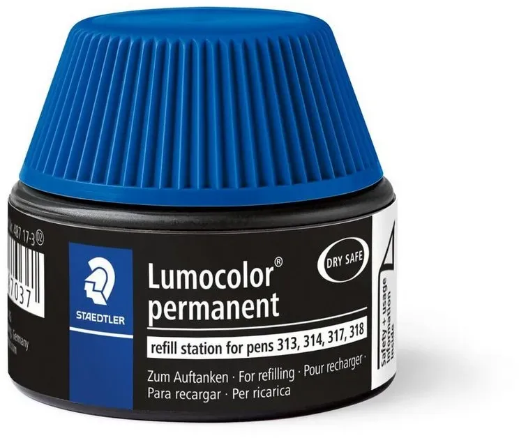 Zustand: Neu - 262,00 € / l - Permanent-Marker - STAEDTLER - 488 51-9 ST - EAN: 4007817488195 - Efficient for ecology: Überfüllen ist unmöglich, da der Stift nur die maximal mögliche Tintenmenge aus der Tankstelle herauszieht Einfaches und sauberes Nachfüllen Nach wenigen Minuten ist der Stift wieder schreibbereit Nach 3-4 Stunden wieder komplett gefüllt Mehrfaches Nachfüllen möglich - 15 Händler im amazon.de Marketplace Eine weitere preiswerte Option für eine blaue, wasserfeste und lichtbeständige Nachfülltinte. ![]() ![]() STAEDTLER Marker STAEDTLER Nachfülltinte Lumocolor® Refill permanent 487 17-3 blau, wasserfest, lichtbeständig blau