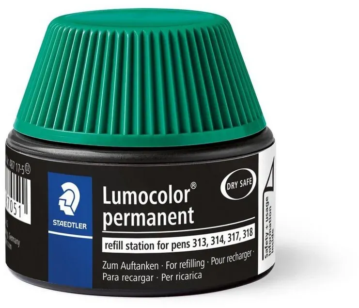 Verfügbarkeit: lieferbar-in 8-10 Werktagen bei dir - 35.00€/100ml - Kategorie: Grafik- & Zeichenbedarf - Staedtler - GTIN:4007817487037 - Schreibfarbe , Blau, Farbe , blau, Material , Tinte, Gewicht , 0 g, Herstellungsland , Deutschland, - 5,25 Euro bei OTTO - gefunden von billiger.de Eine günstige grüne Nachfülltinte, die wasserfest und lichtbeständig ist. ![]() ![]() STAEDTLER Marker STAEDTLER Nachfülltinte Lumocolor® Refill permanent 487 17-5 grün, wasserfest, lichtbeständig grün