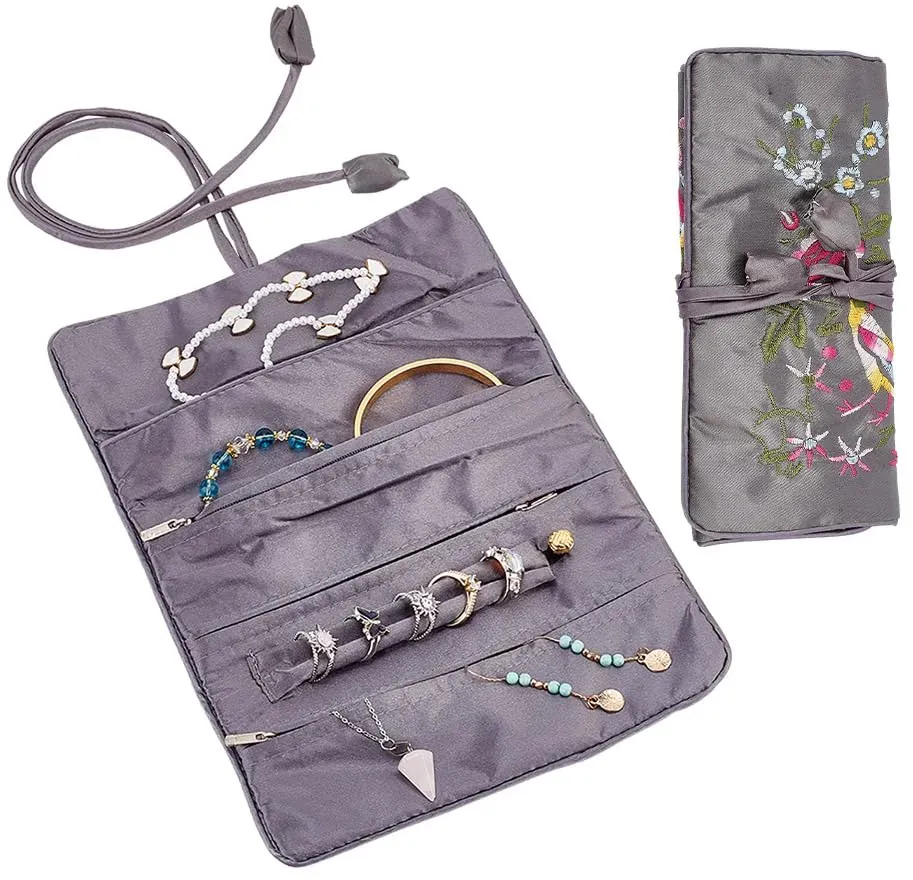 Gewöhnlich versandfertig in 3 bis 4 TagenGOMAKERER Schmuckbeutel mit Seidenblumen, Stickerei, Schmuck, Luxus-Geschenktasche, Armbandtasche mit Reißverschluss und Kordelzug, Rolletaschen für Geschenkverpackung, Grau, 2 Stück