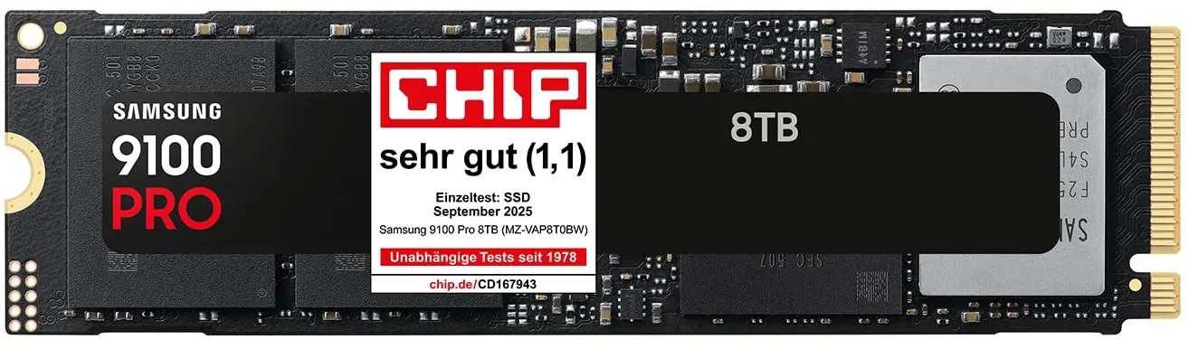 17 Händlerangebote bei billiger.de - Kategorie: SSD Festplatten - Samsung - Next Level Drive: PCIe 5.0 NVMe SSD für High-End-Gaming auf dem PC, 4K-Video- und 3D-Bearbeitung, AI-Inhaltsgenerierung und mehr, Bis zu 2-mal schneller als die 990 PRO Atemberaubende Geschwindigkeit dank PCIe 5.0: Sequentielle Lese-/Schreibgeschwindigkeiten von bis zu 14.800 MB/s bzw. 13.400 MB/s, Zufällige Lese-/Schreibvorgänge von bis zu 2.200K/2.600K IOPS1 2 3 Innovatives Leistungs- & Wärmemanagement: Fortschrittliche 5-nm-Controller-Power-Architektur für eine bis zu 49 % bessere Energieeffizienz im Vergleich zur 990 PRO4, Beeindruckendes Wärmemanagement Speicherkapazitäten von bis zu 8 TB im kompakten M.2-Formfaktor (2280), Next-Level-Performance für leistungsstarke (Gaming-)PCs und Notebooks/Ultrabooks Einfache Laufwerksverwaltung: Mit nutzungsfreundlicher Samsung Magician Software für Laufwerk-Updates und Leistungsoptimierung5 Lieferumfang: 1 x Samsung 9100 PRO NVMe M.2 SSD, Speicherkapazität: 8 TB, MZ-VAP8T0BW - GTIN:8806095811680 Die Samsung 9100 PRO SSD mit Kühlkörper ist eine High-End 8TB PCIe 5.0 SSD, die maximale Performance für professionelle Anwendungen und Gaming liefert. ![]() ![]() Samsung 9100 PRO SSD - 8TB - Mit Kühlkörper - M.2 2280 - PCIe 5.0