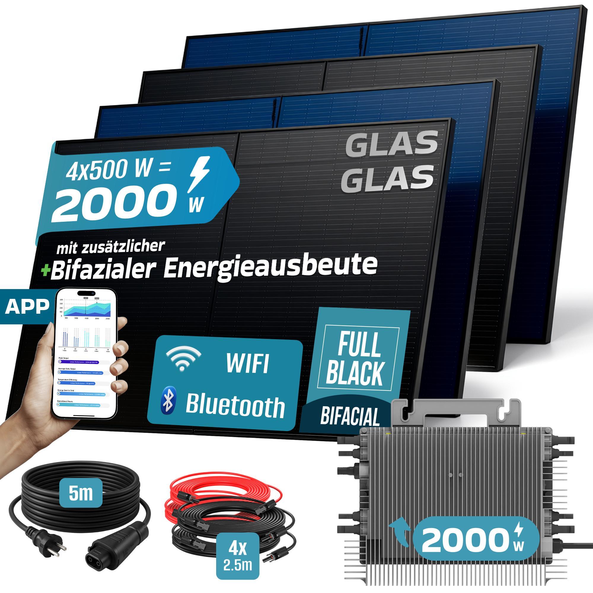 EAN: 4255656236891 - Balkonkraftwerk von SUNNIVA 2000 W / 2000 W Das hochwertige Balkonkraftwerk von SUNNIVA mit einer Maximalleistung von 2000 W / 2000 W überzeugt durch Qualität und Zuverlässigkeit. Im Lieferumfang enthalten ist ein Mikro-Wechselrichter mit einer Leistung von 2000 W, der für den netzkonformen Betrieb ausgelegt ist.Ob auf dem Balkon, dem Hausdach, der Garage, der Terrasse oder freistehend im Garten - das SUNNIVA Balkonkraftwerk bietet flexible Einsatzmöglichkeiten und unterstützt eine nachhaltige Eigenstromversorgung. Mit zusätzlicher bifazialer Energieausbeute.Mit der Fähigkeit, Sonnenlicht von beiden Seiten einzufangen, kann dieses bifaziale 500-Watt-Solarmodul im Vergleich zu herkömmlichen Solarmodulen mehr Energie liefern. Produkt-Highlights:Plug & Play AnschlussmöglichkeitMikro-Wechselrichter DEYE SUN-M200G4-EU-Q0 2000 WattWIFI- & Bluetooth-KommunikationSolarmodule Gesamtleistung: 2000 W (4 500 W)Bifaziale Modultechnologie für optimale Stromausbeute SOLARMODULELeistung pro Panel: PMax 500 WattBifazialZellentyp: Monokristallin NMaße(LxBxH): ca.1906x 1134 x 30 mmFrontscheibe mit Antireflexbeschichtung: ca. 2,0 mm Rückscheibe mit Wärmegehärtetem Glas: ca. 2,0 mmRahmen: Eloxierte Aluminiumlegierung, SchwarzGewicht: ca.30 kgBIFAZIAL, Full Black, Glas-Glas Lieferumfang: 4 x Solar Module mit je 500W PMax: 2000W Gesamtleistung und zusätzlicher BIFAZIALER Energieausbeute1 x Mikro-Wechselrichter DEYE SUN-M200G4-EU-Q0 2000 Watt1 x Anschlusskabel 5m vom ... Dieses Balkonkraftwerk-Set bietet bifaziale Solarmodule und den Deye M200G4 Wechselrichter zu einem guten Preis. ![]() ![]() VALE Balkonkraftwerk Bifazial 1760 Wp Full Black - Deye M200G4 Wechselrichter - Hochwertiges Solarpanel Set - 5m AC-Kabel
