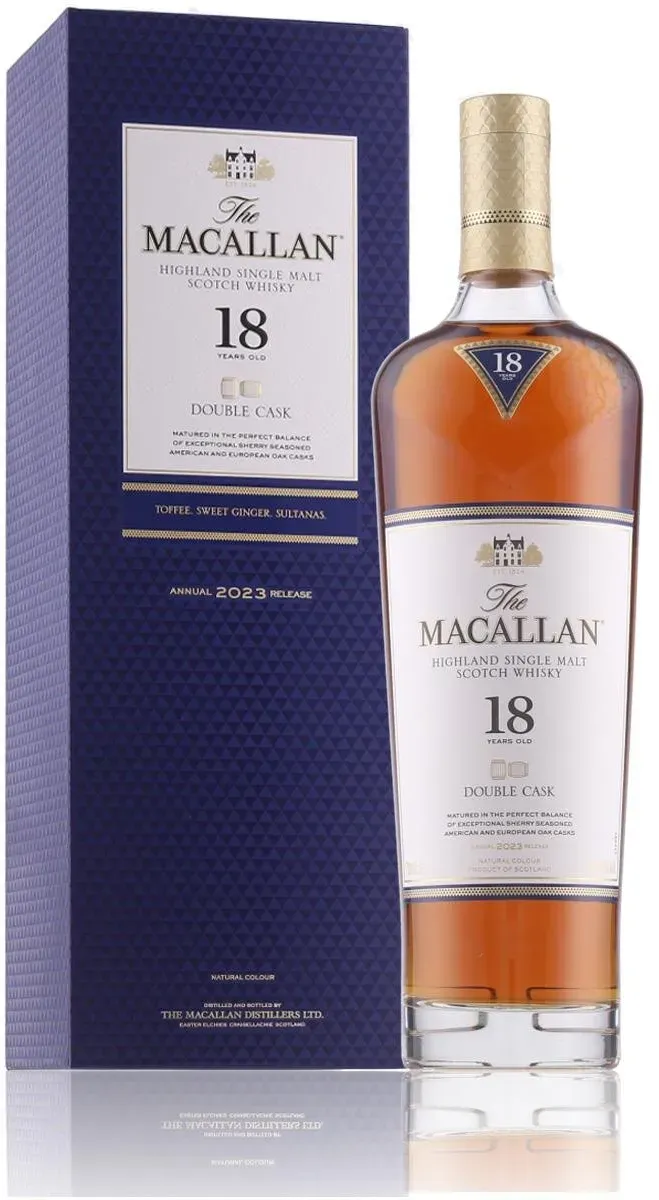 15 Händlerangebote bei billiger.de - Kategorie: Whisky - The Macallan - Der Macallan Double Cask 18 YO ist ein filigran ausgewogener Single Malt Whisky, der durch die ideale Harmonie von zwei Eichenfässern entsteht Farbe: Bernsteinfarbener Honig Aroma: Trockenfrüchte, Ingwer und Toffee; Reichhaltige Orange mit einem Hauch von Nelken und Muskatnuss Geschmack: Reichhaltige Rosinen und Sultanine mit Noten von Karamell, Vanille und Ingwer, ausgewogen mit würzigem Holz und Zitrusfrüchten Nachklang: Warmes, würziges Eichenholz mit Ingwer, das sich zu süßer Orange wandelt - GTIN:5010314309862 Eine weitere attraktive Option für den Macallan 18 Double Cask 2023 in Geschenkbox zu einem guten Preis. ![]() ![]() The Macallan 18 Years Double Cask Whisky 2023 43% Vol. 0,7l in Geschenkbox