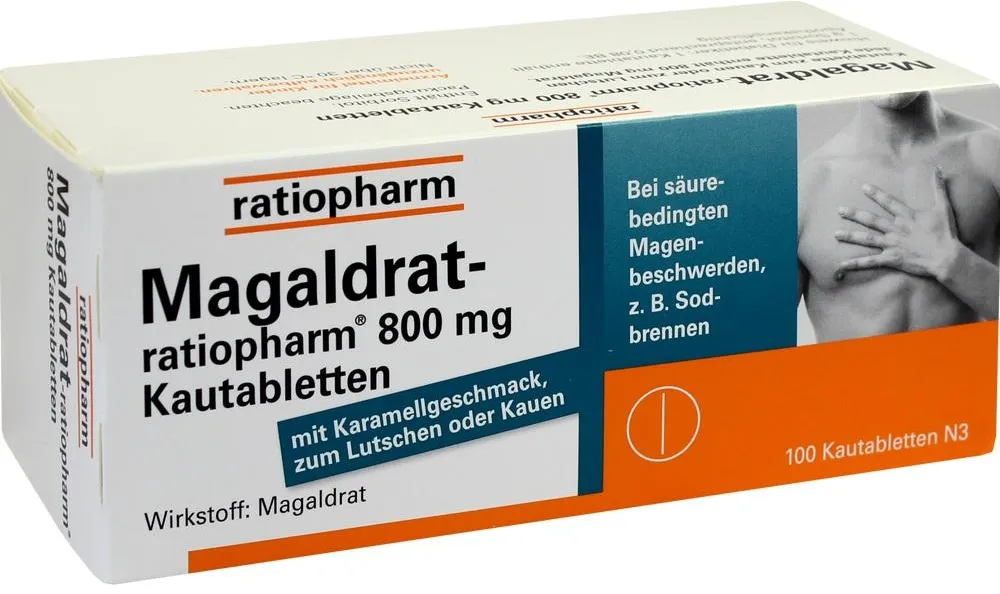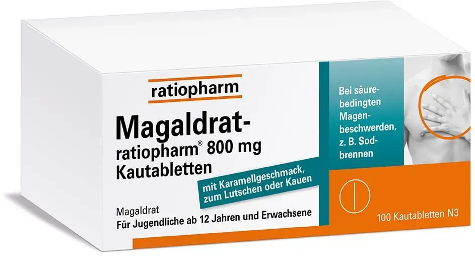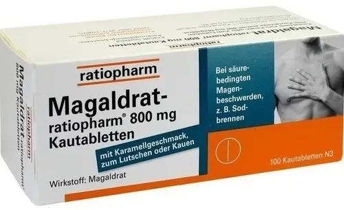 Zustand: Neu - 0,26 € / Stück - Vitamine, Mineralien & Ergänzungsmittel - ratiopharm ratiopharm GmbH, Graf-Arco-Str. 3, 89079 Ulm - 4869893 04869893 - EAN: 4150048698939 - EFFEKTIV BEI MAGENBESCHWERDEN: Magaldrat-ratiopharm 800 mg Kautabletten neutralisieren die überschüssige Magensäure und lindern Beschwerden wie Sodbrennen oder saures Aufstoßen effektiv. SCHNELLE LINDERUNG: Die Kautabletten haben sich bei säurebedingten Beschwerden zudem durch die rasche Linderung bewährt. SCHÜTZT DIE MAGENSCHLEIMHAUT: Der Wirkstoff Magaldrat bildet eine zusätzliche Schutzschicht auf der Magenschleimhaut. PRAKTISCH FÜR UNTERWEGS: Magaldrat-ratiopharm 800 mg Kautabletten sind durch die Einnahme ohne Wasser auch für unterwegs gut geeignet. FÜR JUGENDLICHE UND ERWACHSENE: Geeignet für die Anwendung bei Jugendlichen ab 1 n und Erwachsenen. - 3 Händler im amazon.de Marketplace ![]() ![]() Magaldrat-ratiopharm 800 mg Kautabletten: Schnelle Linderung bei Sodbrennen und säurebedingten Magenschmerzen mit dem Wirkstoff Magaldrat. Leicht anzuwenden. 100 Kautabletten.