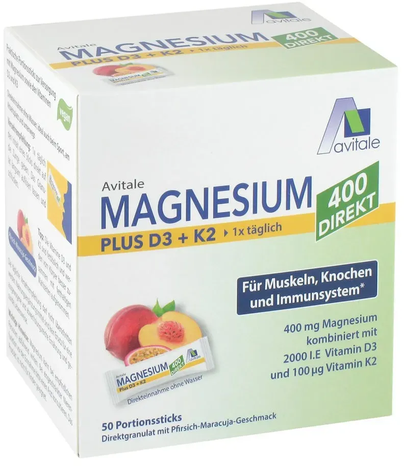 Kategorie: Arzneimittel - Avitale - GTIN:4024075597438 - PZN:19213052 - Anwendungsgebiet von Magnesium 400+D3+K2 Direktsticks Pfirsich-Maracuja-GeschmackMagnesium 400+D3+K2 Direktsticks Pfirsich-Maracuja-Geschmack sind ein Nahrungsergänzungsmittel mit 400mg Magnesium kombiniert mit den Vitaminen D3 und K2 für Muskeln & Knochen* sowie das Immunsystem*, mit Süßungsmittel. Magnesium 400+D3+K2 Direktsticks Pfirsich-Maracuja-Geschmack sind praktische Portionssticks mit angenehmem Pfirsich-Maracuja-Geschmack zur Direkteinnahme ohne Wasser - ideal für unterwegs. Magnesium wird vom Körper für ca. 300 Stoffwechselprozesse benötigt, einschließlich der Muskel- und Nervenfunktion. Vitamin D hat viele Funktionen im Körper, darunter die Unterstützung des Immunsystems, der Knochen und der Muskelfunktion. Außerdem trägt es zu einem normalen Calciumspiegel im Blut bei. Vitamin K ist ein weiterer Schlüsselnährstoff für die Knochengesundheit. Knochen & Muskeln* Magnesium und Vitamin D3 unterstützen den Erhalt normaler Knochen und eine normale Muskelfunktion. Auch Vitamin K trägt zur Erhaltung normaler Knochen bei. Immunsystem* & Energie Vitamin D fördert die normale Funktion des Immunsystems. Magnesium leistet einen Beitrag zu einem normalen Energiestoffwechsel und zur Verringerung von Müdigkeit und Ermüdung. Blutbildung & Zellteilung Vitamin K trägt zu einer normalen Blutgerinnung bei. Magnesium und Vitamin D haben eine Funktion bei der Zellteilung. Nerven & Psyche Magnesium ist hilfreich ... Die Avitale Direktsticks sind ideal für unterwegs und bieten eine praktische Einnahmeform mit angenehmem Pfirsich-Maracuja-Geschmack. ![]() ![]() Avitale Magnesium 400 plus D3+K2 direkt Pfirsich-Maracuja 50X2,5 g