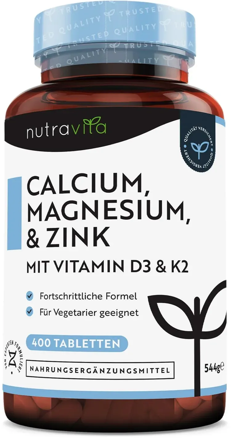 Auf Lager Versand durch AmazonCalcium Magnesium Zink - 400 Hochdosiert vegetarische Tabletten (6 Monate) - Magnesiumoxid mit Vitamin D3, K2, Selen, Mangan - Komplex mit 600mg Kalzium pro Tagesdosis - Knochen + Muskeln - Nutravita