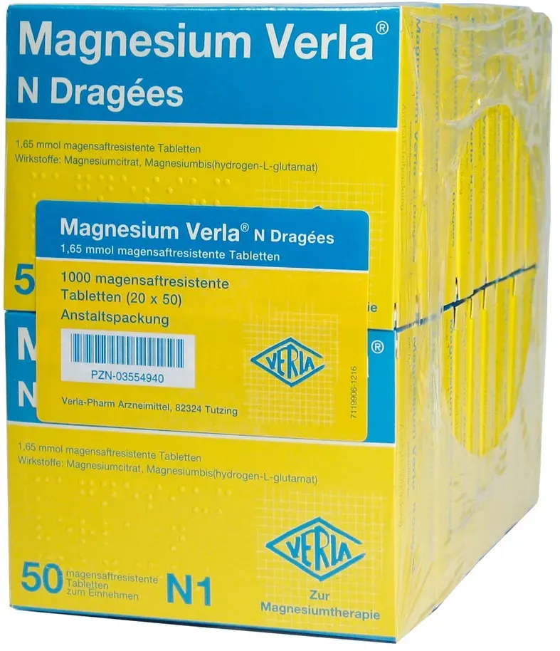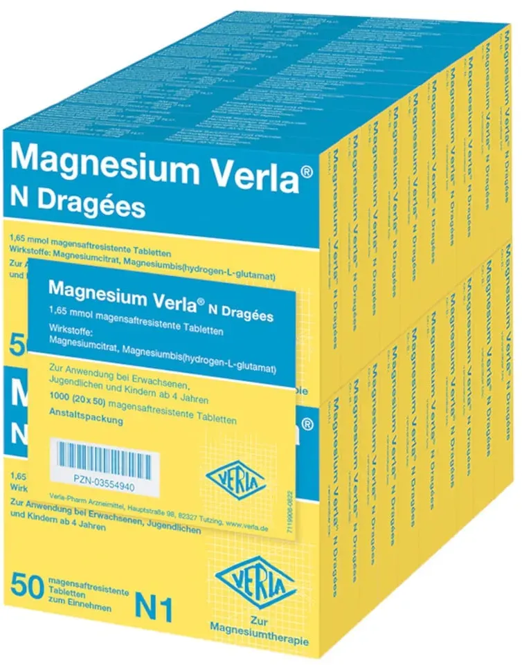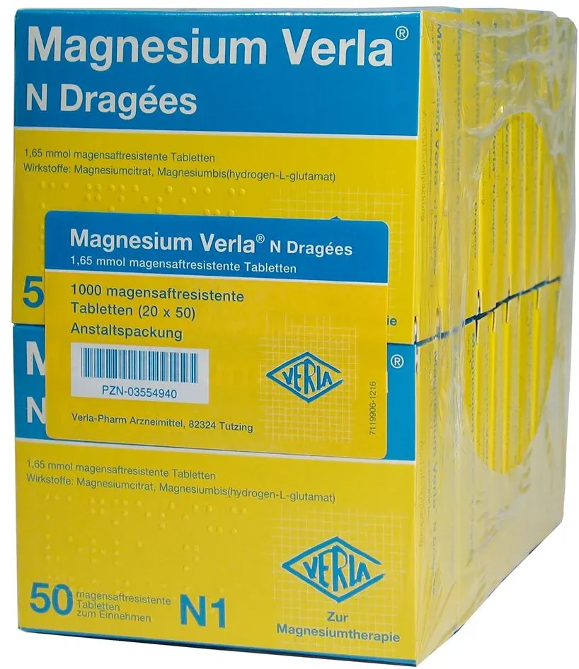 0,05 /St - Kategorie: Arzneimittel - VERLA - GTIN:4150035549404 - PZN:03554940 - Magnesium Verla N Dragees 20X50 St - rezeptfrei - von Verla-Pharm Arzneimittel GmbH & Co. KG - Tabletten magensaftresistent - 1000 St - 51,11 Euro bei DocMorris Apotheke - gefunden von billiger.de Mit 51.55 Euro für 1000 Stück ist dies eine sehr große und kosteneffiziente Packung für den Langzeitgebrauch. ![]() ![]() Magnesium Verla N Dragees 1000 ST