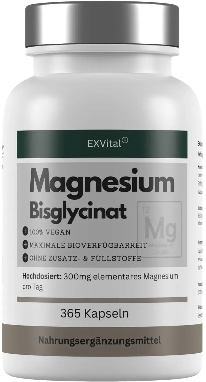 Kategorie: Nahrungsergänzungsmittel - NaturElan - Hervorragendes Preis-Leistungsverhältnis: 180 hochdosiert Magnesium Bisglycinat Kapseln pro Dose. Hochdosiert mit 2,307mg magnesiumbisglycinat (entspricht 300mg reines Magnesium) pro Tagesdosis (3 Kapseln). Gute Verträglichkeit und hohe Bioverfügbarkeit: Magnesium Bisglycinat ist eine Verbindung aus Magnesium und Glycin. Glycin hat die kleinste Molekülgröße unter den Aminosäuren und kann somit effektiv durch die Darmwand aufgenommen werden. Magnesiumbisglycinat ist auch in hohen Dosen sehr gut verträglich. 100% vegan und ohne unnötige Zusätze: Verwendung rein pflanzlicher Kapselhüllen, ohne unnötige Zusätze wie Magnesiumstearat, etc. HOCHDOSIERTE ERGäNZUNG: Magnesium trägt zu einer normalen Funktion des Nervensystems und zur Verringerung von Müdigkeit und Ermüdungserscheinungen bei. Für eine kontinuierliche Unterstützung des Körpers! Qualität seit 1987: Die Marke NaturElan wurde 1987 gegründet. Unser Ziel ist es, kostengünstige Gesundheitsprodukte anzubieten. Wenn Sie nicht zufrieden sind, kontaktieren Sie uns bitte! - 15,29 Euro bei Amazon Marketplace Health & Personal Care - gefunden von billiger.de Eine hochdosierte und zusatzstofffreie vegane Option für bewusste Konsumenten. ![]() ![]() Exvital Magnesiumbisglycinat, 365 vegane Kapseln 300 mg elementares Magnesium pro Tagesdosis, Magnesiumglycinat, hochdosiert & ohne Zusatzstoffe