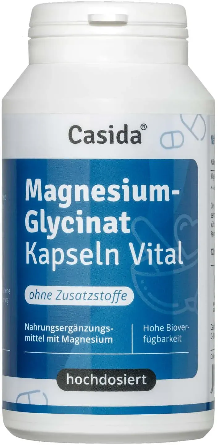 Kategorie: Nahrungsergänzungsmittel - Heiltropfen - GTIN:3830069050534 - Löst sich leicht und vollständig in gereinigtem Wasser. Reines Magnesiumglycinat als Magnesiumbisglycinat. Fördert tiefe Entspannung und erholsamen Schlaf: Magnesium trägt zur Regulierung beruhigender Neurotransmitter wie GABA bei, während Glycin nachweislich die Schlafqualität verbessert und den natürlichen zirkadianen Rhythmus des Körpers unterstützt. Zusammen helfen sie, den Geist zu beruhigen, den Körper zu entspannen und einen tiefen, erholsamen Schlaf zu fördern. Kann bei der Wiederherstellung des zellulären Magnesiumspiegels helfen. Kann Schmerzen lindern. Unterstützt Energie und Vitalität: Magnesium ist essentiell für die ATP-Produktion und spielt eine wichtige Rolle bei der Aufrechterhaltung eines gesunden Energieniveaus und der Verringerung von Müdigkeit. Gesunde Muskeln, Knochen und Herz: Trägt zu einer normalen Muskelfunktion bei, unterstützt die Knochendichte und hilft, Herzrhythmus und Blutdruck zu regulieren. Unterstützung des Nervensystems: Hilft, mentales Gleichgewicht, Stressresistenz und Konzentration zu erhalten insbesondere unter anspruchsvollen Bedingungen. Magenschonend: Im Gegensatz zu einigen Magnesiumformen ist Bisglycinat leicht verdaulich und wirkt bei bestimmungsgemäßer Einnahme nicht abführend. Mit Wasser oder Ihrem Lieblingsgetränk mischen, idealerweise abends zur Förderung von Ruhe und Schlaf oder zu jeder anderen Tageszeit zur Unterstützung des allgemeinen ... Ein hochwertiges Produkt, das in Deutschland produziert und laborgeprüft ist, was für Qualität und Sicherheit spricht. ![]() ![]() Casida GmbH Casida Magnesiumglycinat Kapseln hochdosiert - Magnesium Bisglycinat Kapseln, 745mg Magnesiumglycinat je Kapsel, davon 105mg Elementares Magnesium, laborgeprüft, In Deutschland produziert - 120 Kps.