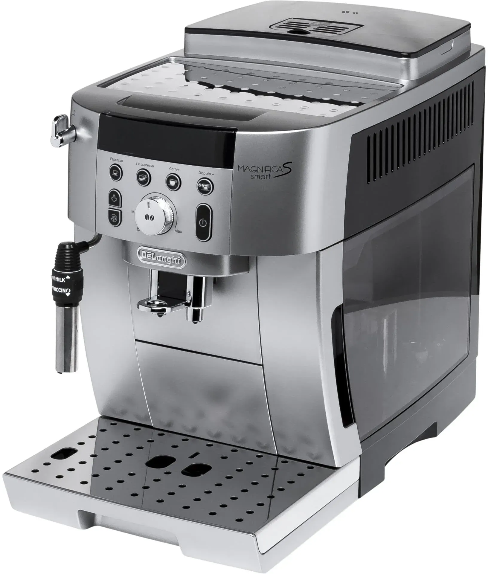 Vollautomatische Kaffeevollautomaten Espressomaschinen Kaffeemaschine Vollautomat Kaffee- und Espressomaschinen - EAN:8004399325067 - Die Magnifica S ECAM 22.110.SB von DeLonghi ist ein Kaffeevollautomat der Extraklasse. Nach dem Einschalten benötigt die Maschine ca. eine Minute zum Erhitzen, anschließend kann man sich auch gleich schon den ersten Kaffee zubereiten. Der Automat ist sehr leicht zu bedienen, der Wassertank kann ganz einfach nach vorne entnommen und befüllt werden. Der Bohnenbehälter mit Aromaschutzdeckel befindet sich oben, genauso wie auch der Kaffeepulverschacht. Der Mahlgrad sowie die Kaffeemenge und -stärke können einfach eingestellt werden. Die integrierte Milchaufschäumdüse ermöglicht zudem die Zubereitung von traditionellem Milchschaum oder heißer Milch für zusätzlichen Kaffeegenuss. Sobald eine Entkalkung nötig ist, wird es angezeigt und man kann mit wenigen Handgriffen ein Entkalkungsprogramm abspielen lassen, das nach ca. einer halben Stunde abgeschlossen ist. - gefunden von Kelkoo Die "Smart" Version bietet zusätzliche Funktionen und ein modernes Design zu einem fairen Preis. ![]() ![]() De'Longhi Magnifica S Smart ECAM 250.23 SB silber/schwarz