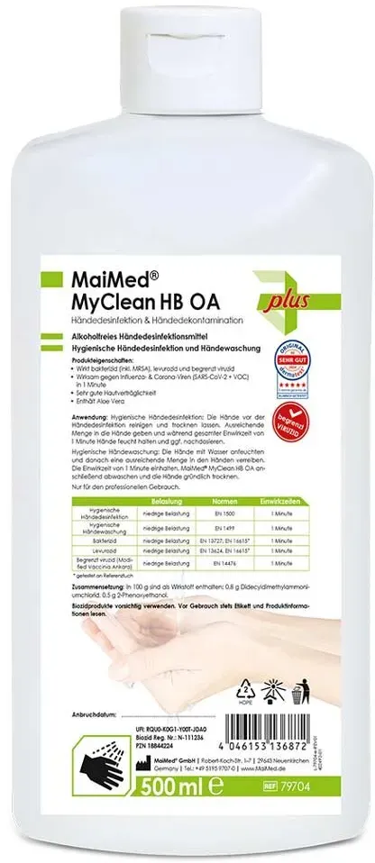 Verfügbarkeit: 1-3 Werktage - 5,38€/l - Kategorie: Desinfektionsmittel - Maimed - GTIN:4046153136872 - Maimed MyClean HB OA Händedesinfektion plus 500 ml Zuverlässige und alkoholfreie Händedesinfektion mit Aloe Vera für effektiven Schutz. MaiMed® MyClean HB Handdesinfektion ohne Alkohol bietet eine hochwirksame Lösung zur schnellen und hygienischen Händedesinfektion. Entwickelt für den professionellen Einsatz in Arztpraxen, Pflegeeinrichtungen und im privaten Bereich, sorgt es für einen effektiven Schutz vor einer breiten Palette von Bakterien und Viren. Das alkoholfreie Desinfektionsmittel enthält pflegendes Aloe Vera, das die Haut schont und Hautirritationen vorbeugt, auch bei häufiger Anwendung. Es ist besonders geeignet, wenn schnelle Handhygiene erforderlich ist. Die gebrauchsfertige Lösung wirkt bakterizid, levurozid und begrenzt viruzid und erfüllt die hohen Anforderungen der europäischen Normen für Händedesinfektion. Das Produkt ist ein Biozid und rt zuverlässigen Schutz vor Infektionen. Es ist wichtig, die Hände während der gesamten Applikation feucht zu halten und die Standard-Einreibemethoden zur hygienischen Händedesinfektion zu befolgen. Bei stark verschmutzten Händen empfiehlt es sich, diese vor der Desinfektion mit Wasser und Seife zu reinigen. Das Produkt trägt die BAuA-Nummer N-111236 und hat die UFI-Nummer RQU0-K0G1-Y00T-JDA0. Biozidprodukte vorsichtig verwenden. Vor Gebrauch stets Etikett und Produktinformationen lesen. - 2,69 ... Diese kleine 100ml Flasche ist perfekt für unterwegs und passt in jede Tasche. ![]() ![]() Maimed MyClean® HB, Händedesinfektion, alkoholisch, 100ml