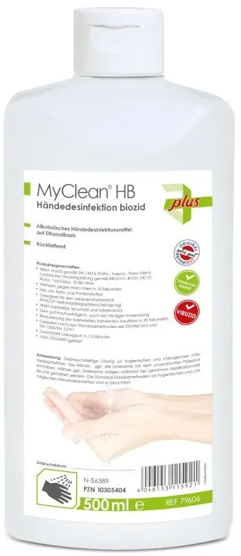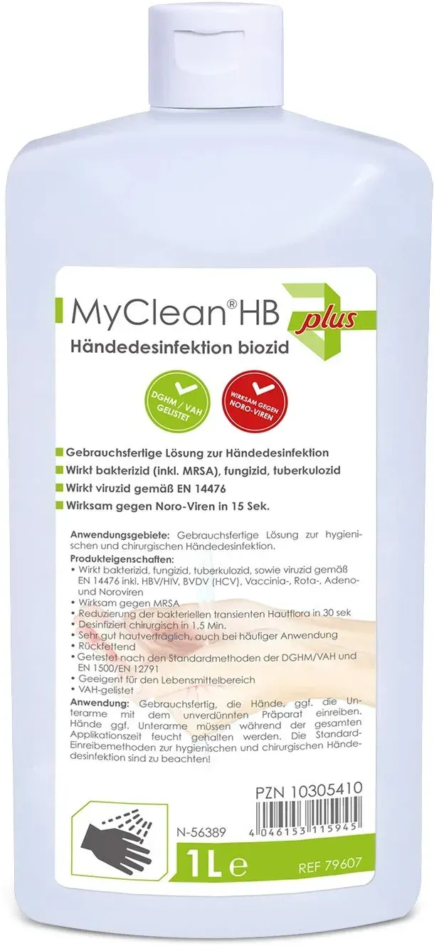 Verfügbarkeit: sofort lieferbar - 9.86 € / 1 Liter - Kategorie: Desinfektionsmittel - Maimed - GTIN:4046153115921 - PZN:10305404 - ? Wirkt viruzid gemäß EN 14476 (Polio Virus Typ 1) ? Wirkt gemäß EN 14476 (Adeno-, Vaccinia-, Noro-Viren) ? Wirkt bakterizid, levurozid, mykobakterizid und tuberkulozid ? Wirksam gegen Corona-Viren (SARS-CoV-2 + VOC) in 30 Sekunden ? Frei von Farb- und Parfümstoffen ? Geeignet für den Lebensmittelbereich (HACCP-Verkehrsfähigkeitsbescheinigung) ? Sehr gut hautverträglich, auch bei häufiger ? Getestet nach den Standardmethoden der VAH (EN 1500/EN 12791) ? VAH-gelistet Anwendung: Hände vor der Desinfektion reinigen und trocknen lassen. Ausreichende Menge Händedesinfektionsmittel in die Hände geben. Während gesamter Einwirkzeit Hände feucht halten und ggf. nachdosieren. Gefahrenhinweise: Flüssigkeit und Dampf leicht entzündbar. Verursacht schwere Augenreizung. Von Hitze, heißen Oberflächen, Funken, offenen Flammen sowie anderen Zündquellenarten fernhalten. Nicht rauchen. Augenschutz, Gesichtsschutz tragen. Bei anhaltender Augenreizung: ärztlichen Rat einholen/ärztliche Hilfe hinzuziehen. - 4,93 Euro bei Sanicare Apotheke - gefunden von billiger.de Ein attraktiver Preis für die 1000ml Biozid-Variante, ideal für den Vorrat. ![]() ![]() MaiMed MyClean HB Händedesinfektion biozid 1000ml