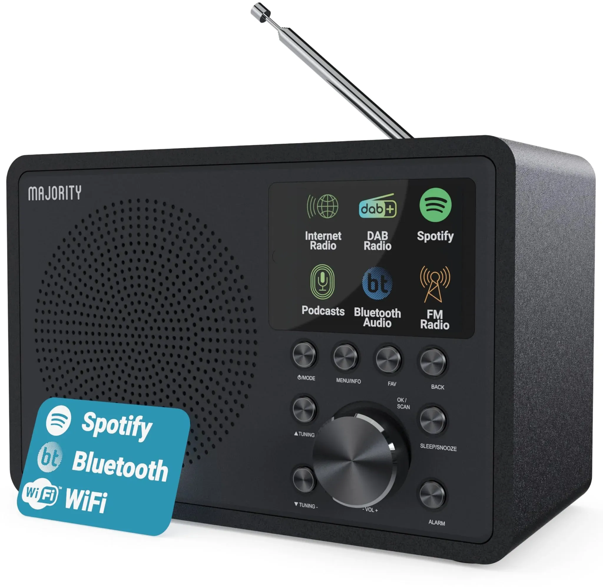 Kategorie: Radios - MAJORITY - GTIN:5056444111029 - INTERNETRADIO, DAB+, UKW: Das Touro kombiniert UKW, DAB Plus Radio und Internetradio WLAN für grenzenloses Hörvergnügen. Erleben Sie ein vielseitiges Digitalradio mit Zugriff auf tausende Sender weltweit Ihr perfektes Radio DAB Plus Internetradio WLAN für Zuhause. BLUETOOTH: Mit der Funktion Dab Radio mit Bluetooth wird Musikstreaming einfach: Koppeln Sie Ihr Smartphone, um kabellos Songs abzuspielen. Dieses Internet Radio bietet kristallklaren Klang, wie es moderne Internet Radios und WLAN Radio Systeme versprechen. SPOTIFY CONNECT, PODCASTS: Genießen Sie Spotify Connect, Podcasts und mehr mit dem Touro Internetradio. Ob Spotify Radio, DAB Plus Digitalradio oder Internetradio entdecken Sie unbegrenzte Unterhaltung über Spotify oder Podcasts. Ihr WLAN-Radio-Internet liefert ein echtes Digitalradio-EDer Touro verfügt außerdem über eine USB-Wiedergabefunktion für USB-Sticks mit bis zu 128 GB und einen 3,55-mm-Line-In-Anschluss für verbesserte Konnektivität. APP-FERNSTEUERUNG: Steuern Sie Ihr Digitalradio bequem über die OKITV-App: Wechseln Sie Sender, stellen Sie die Lautstärke ein und verwalten Sie Ihr Radio-WLAN. Dieses DAB-Internetradio bietet volle Kontrolle und macht das Radio-Internetradio-WLAN besonders benutzerfreundlich.. Das Touro verfügt außerdem über eine Doppelalarmfunktion, sodass Sie jeden Tag mit Ihrer Lieblingsmusik aufwachen können. WAS IST IN DER BOX: Dieses Paket enthält 1 x Touro Radio, 1 x Netzteil und ... Diese Bluetooth-Lautsprecher mit 60W Leistung und vielseitigen Anschlussmöglichkeiten bieten guten Klang für verschiedene Anwendungen. ![]() ![]() MAJORITY D40 Bluetooth Lautsprecher Boxen | 60W 2.0 Aktivlautsprecher | Studio Monitor mit 4"-Treiber | Regallautsprecher für HiFi Stereo mit Optischer, RCA-, USB- und AUX-Eingang | Fernbedienung