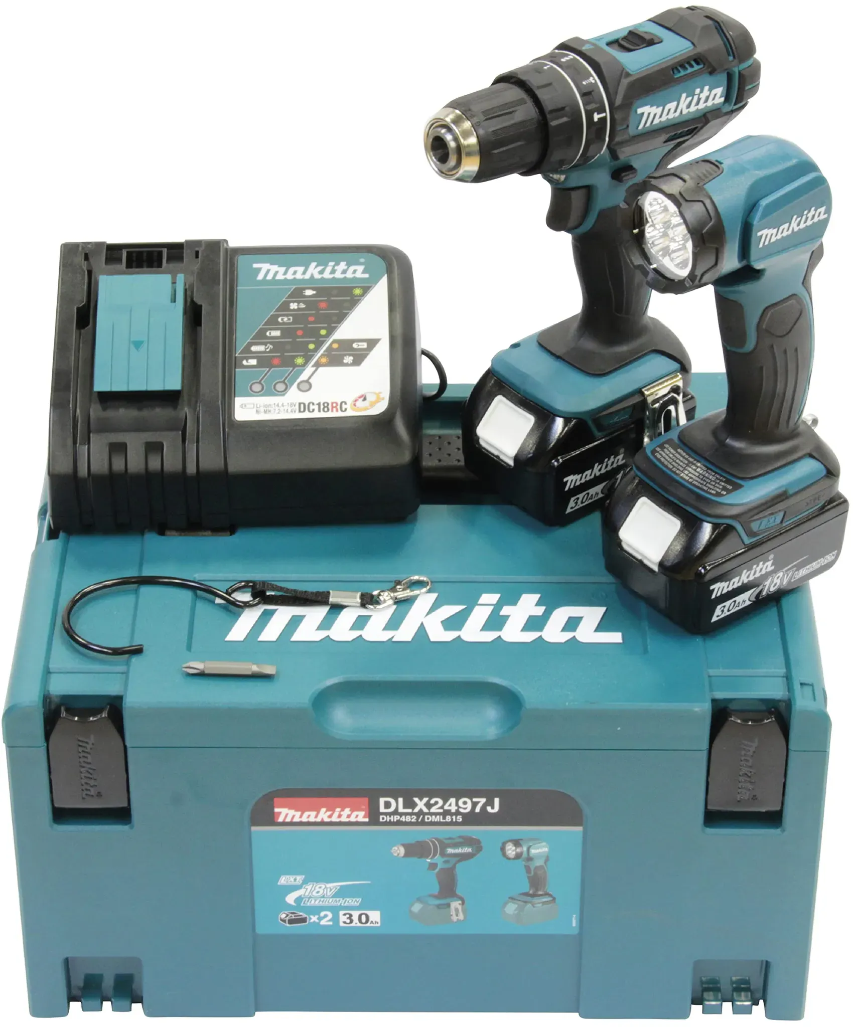 keine Angabe Gewöhnlich versandfertig in 2 bis 3 TagenMakita DLX2497J Akku-Kombo-Kit 18V (DHP482 + DML815) / 3, 0 Ah, 2 Akkus Ladegerät im MAKPAC, Schwarz; Petrol