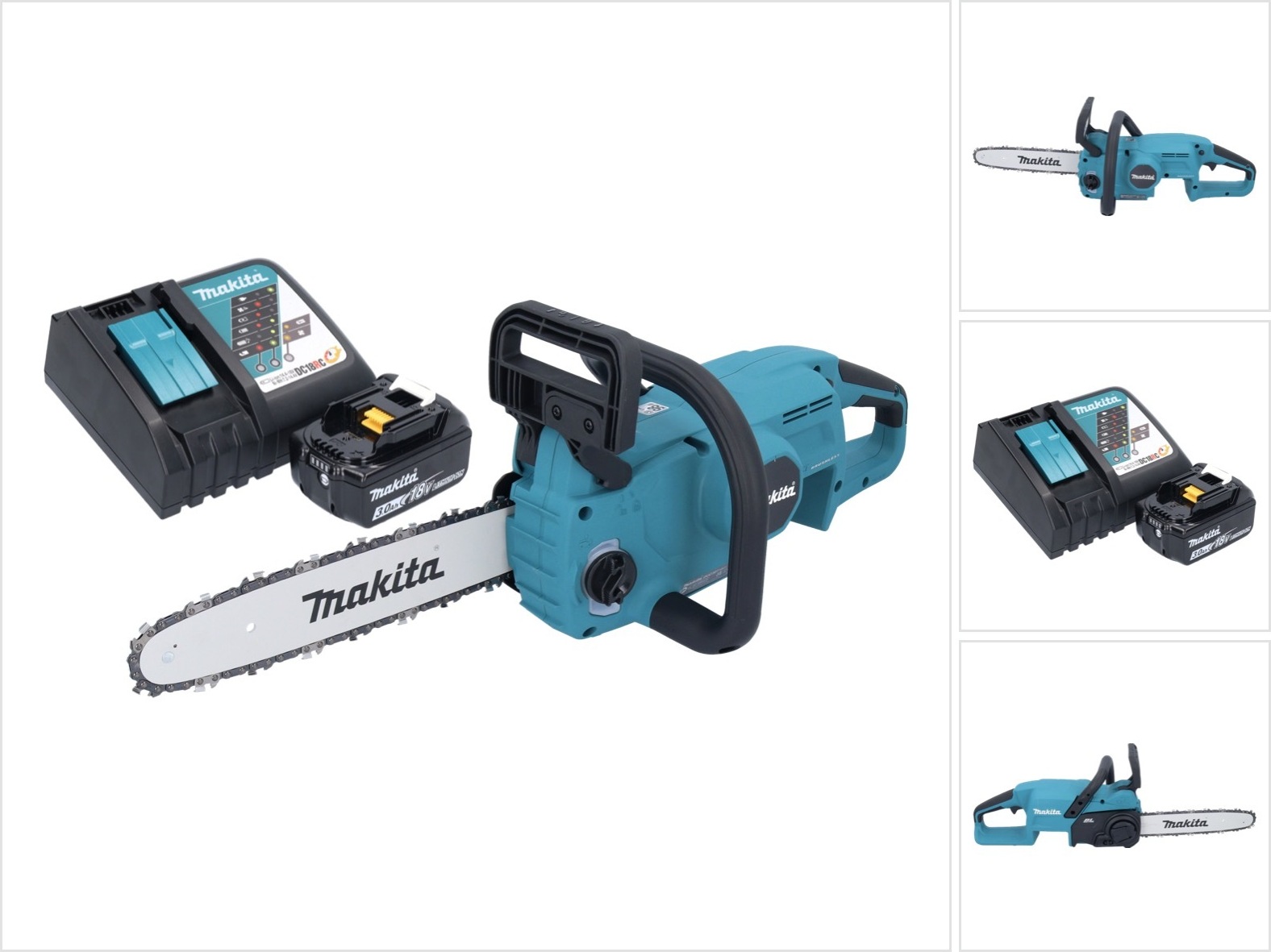 EAN: 4064677082963 - Lieferumfang:- 1x Makita DUC 307 Akku Kettensäge - 1x Sägeschiene 191G15-1 - 1x Sägekette 191H01-8 - 1x Sägekettenöl 100 ml 199897-3 - 1x Sägekettenschutz 413G23-5 - 1x Makita BL 1830 B 18 V 3,0 Ah Akku - 1x Makita DC 18 RC Akku Schnell Ladegerät 7,2 V - 18 V Produktbeschreibung: Der perfekte Begleiter für Gartenarbeiten und vieles mehr: Die Akku-Kettensäge mit einer Schwertlänge von 30 cm ist kompakt und leicht im Gewicht, aber dennoch sehr leistungsstark. Mit einer Ausgangsleistung von 610 W und einer Kettengeschwindigkeit von 7,7 m/s erreicht die Kettensäge ein hohes Arbeitspensum. Dank des neuen Untersetzungsmechanismus wird die Kettengeschwindigkeit konstant gehalten. Der 18 V-Akku und der wartungsfreie, bürstenlose Motor sorgen für eine hohe Leistung und Langlebigkeit. Für noch mehr Arbeitssicherheit sorgen die Kickback-Bremse und die elektrische Bremse. Der Tiefentladeschutz schaltet das Gerät automatisch ab, wenn der Akku fast leer ist. Mit seinem geringen Geräuschpegel und den fehlenden Emissionen ist die Kettensäge besonders komfortabel für den Anwender. Durch die große öltanköffnung kann die Kette leicht befüllt werden und der werkzeuglose Wechsel und Spannen der Kette ist ebenfalls einfach und schnell. Mit dem höheren Drehmoment dank des Getriebeuntersetzungsmechanismus ist die Akku-Kettensäge ein unverzichtbarer Helfer bei Gartenarbeiten und vielem mehr. Technische Daten:Hersteller: Makita Herstellerbezeichnung: Makita DUC 307 ... Ein umfassendes Paket mit einem 5,0 Ah Akku, das eine sehr gute Laufzeit und somit hohe Effizienz bietet. Manomano.d e